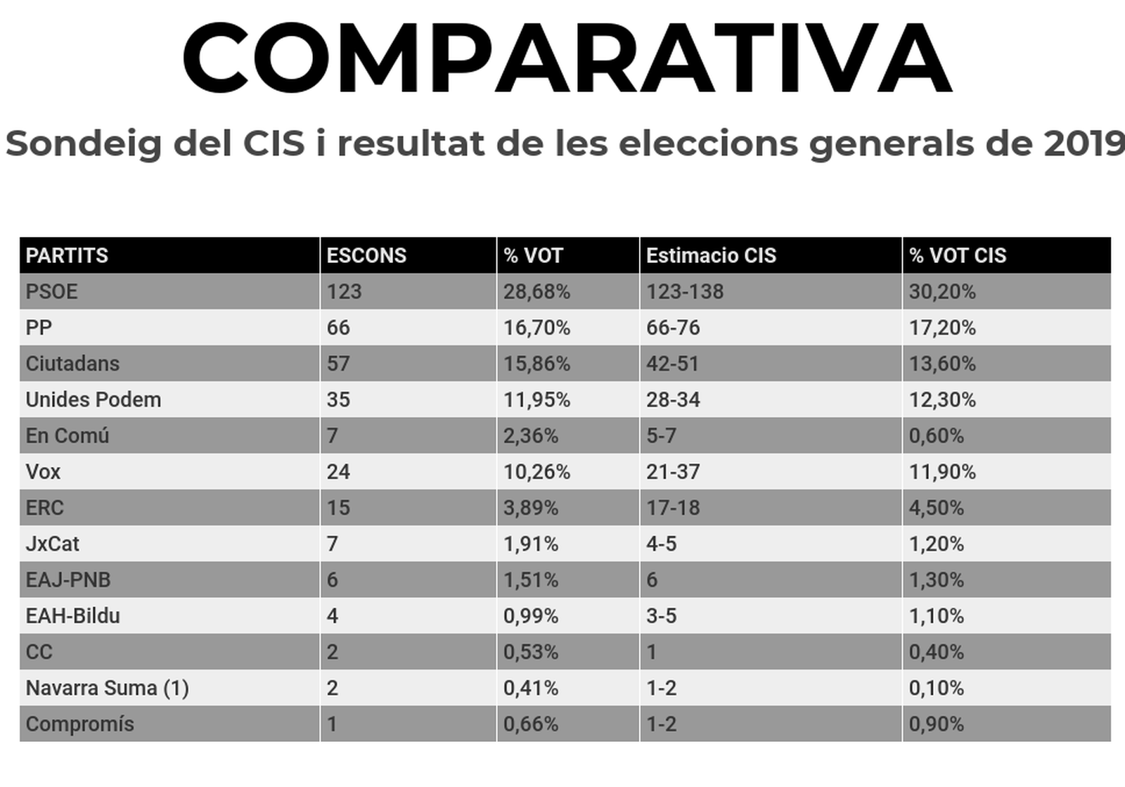 El sondeig, confegit a partir de 16.000 entrevistes telefòniques, va clavar els resultats del PNB -6 diputats- i també va aproximar-se a la realitat d'Unides Podem, que ha obtingut un diputat més del que li concedia l'enquesta. Per contra, va subestimar la pujada de Ciutadans, que ha aconseguit sis diputats més que l'estimació més favorable i, en certa manera, també ha sobreestimat Vox. La formació d'extrema dreta entra al Congrés amb 24 diputats, quan el sondeig pronosticava un màxim de 37, i els analistes advertien, fins i tot, de la possibilitat d'un creixement superior pel vot ocult.