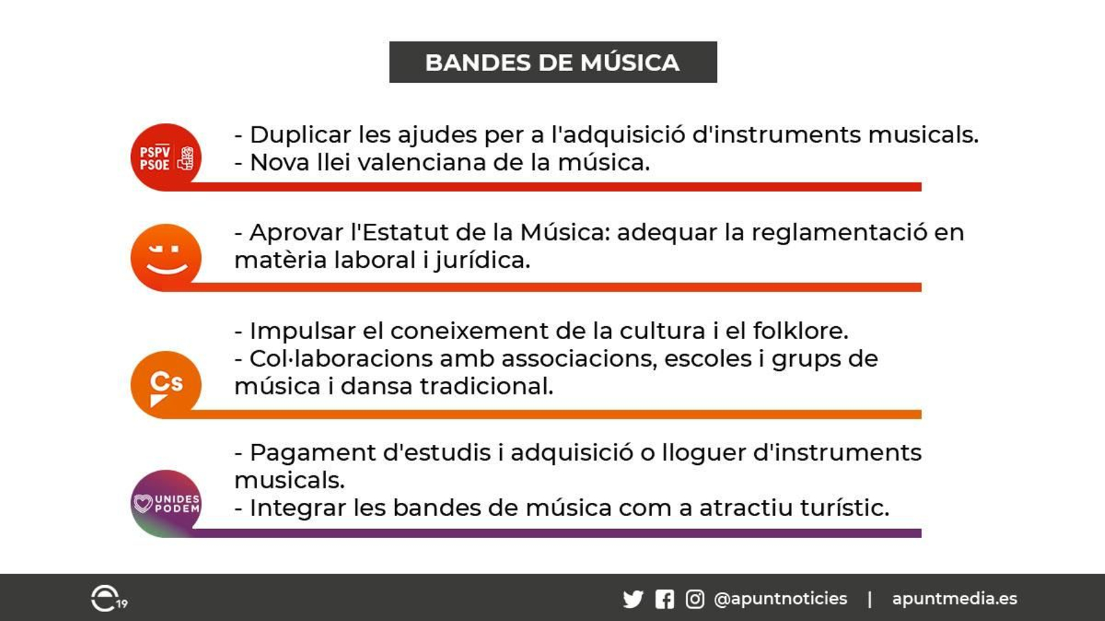 El suport a les bandes de música i l'esport de base desperta la sensibilitat de la ciutadania, per ser dues pràctiques seguides per milers de valencians i valencianes. Les diverses formacions defineixen, en els seus programes electorals, les línies a seguir per a la conselleria de Cultura i Esport en la pròxima legislatura.