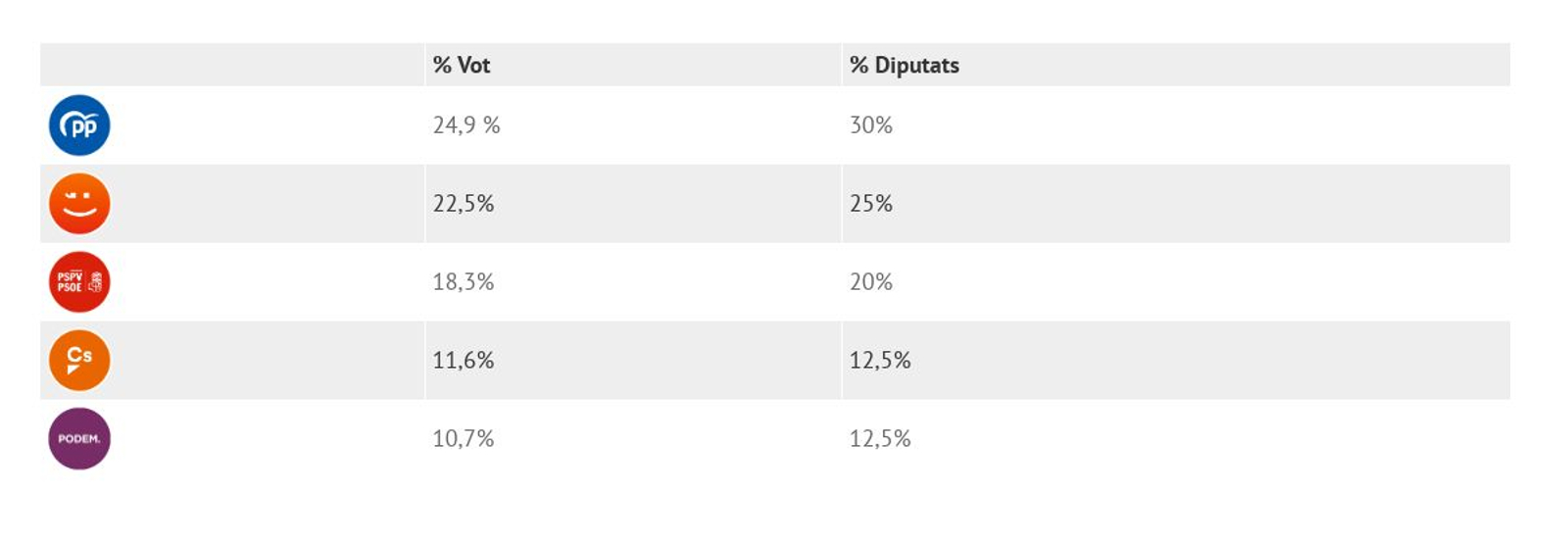 Aquest és el percentatge de vot en cada partit i com es va traduir en percentatge de diputats a la circumscripció de València en les eleccions del 2015.