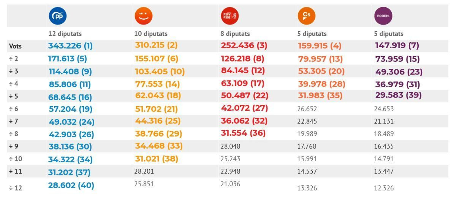 Apliquem ara la fórmula D’Hondt als resultats a les Corts de les últimes eleccions del 2015 per a explicar com es van distribuir els 40 diputats de la circumscripció de València. La taula representa la divisió del vot pel nombre màxim de diputats aconseguits per un partit.