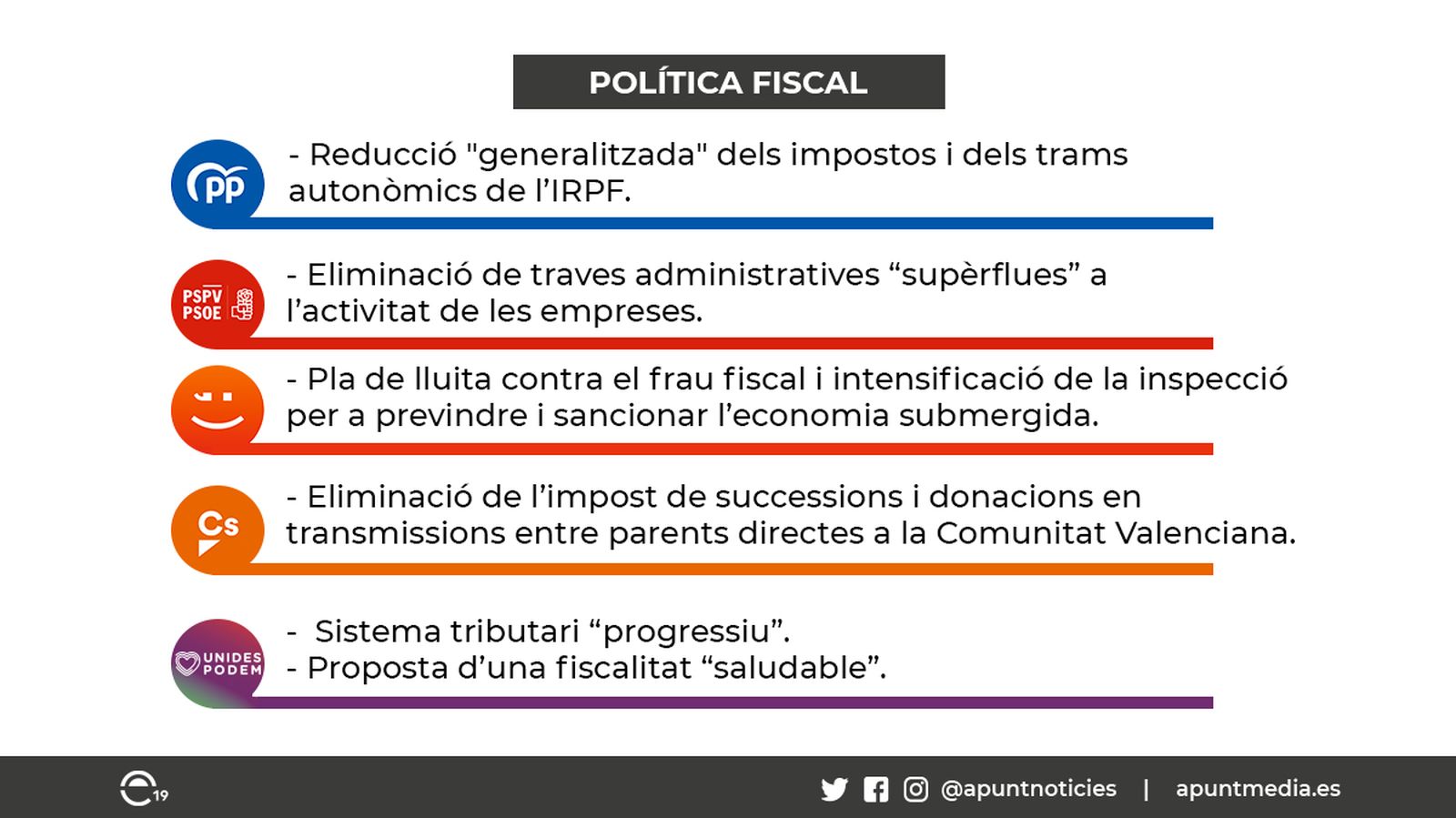 Les formacions polítiques valencianes reclamen de manera unànime un canvi de model en el finançament autonòmic. També advoquen per polítiques de suport a les pimes i als autònoms, i reformes fiscals, que se centren en baixades “generalitzades” d’impostos, com és el cas del Partit Popular i de Ciutadans, o en la redistribució, com és el cas de Compromís o de la coalició Unides Podem-Esquerra Unida. Hem analitzat les propostes de cada programa electoral per a saber què pensa fer cada partit polític amb els impostos i com proposen solucionar l’infrafinançament de la Comunitat Valenciana.