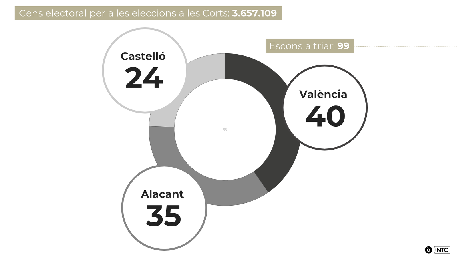 D'acord amb el que disposa l'Estatut d'Autonomia de la Comunitat Valenciana, un total de 99 diputats i diputades conformen el parlament valencià. Atenent a les últimes dades de població que hi ha disponibles en l'Institut Nacional d'Estadística (actualitzades l'1 de juliol de 2018), a la Comunitat Valenciana viuen 4.948.411 persones. Això suposa que cada diputat o diputada representarà 49.984 valencians i valencianes.