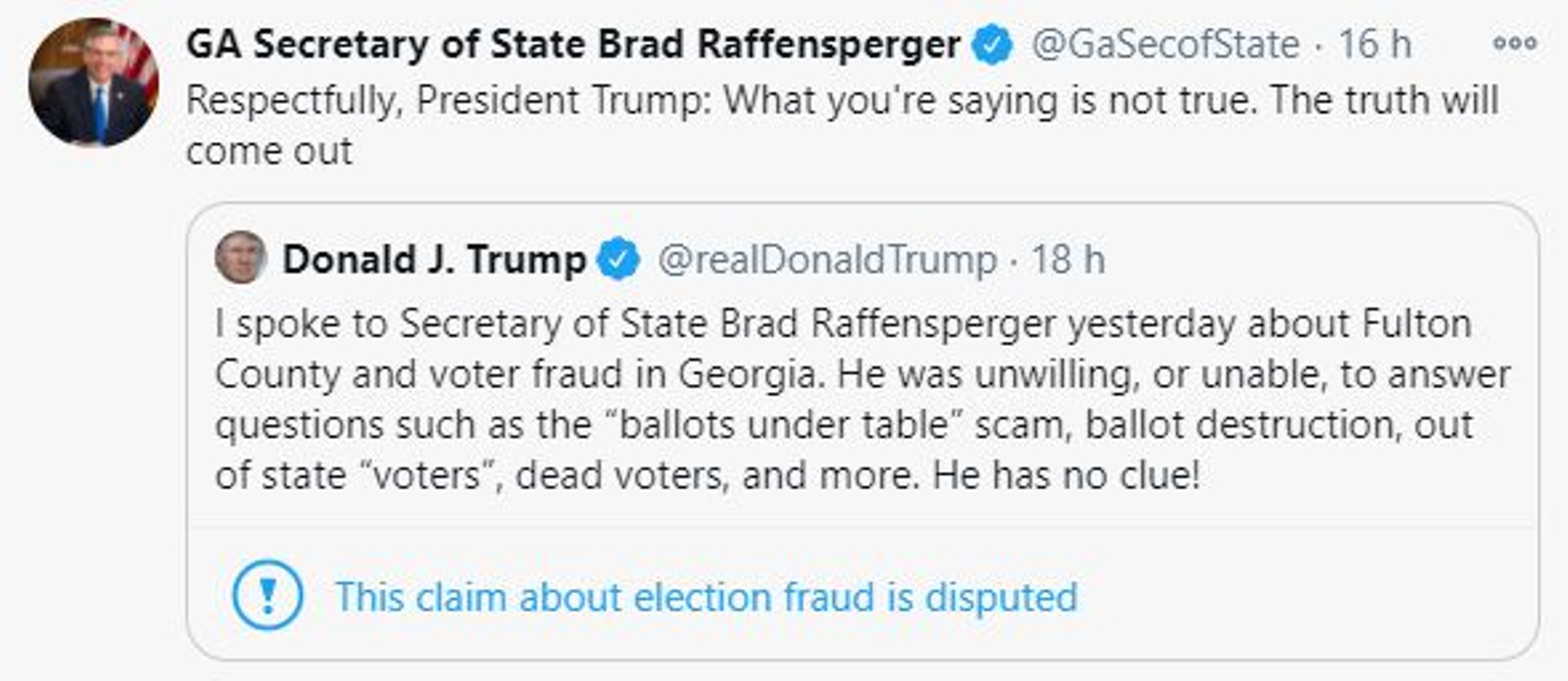 El mateix Trump ha publicat en el seu compte de Twitter que va parlar amb Raffensperger dissabte passat i va tractar qüestions com el resultat en el comtat de Fulton o "el frau en la votació a Geòrgia". L'alt càrrec, per la seua banda, li ha contestat a través de la mateixa xarxa social: "Amb tot el respecte, president Trump: el que vosté està dient no és cert. La veritat eixirà a la llum".