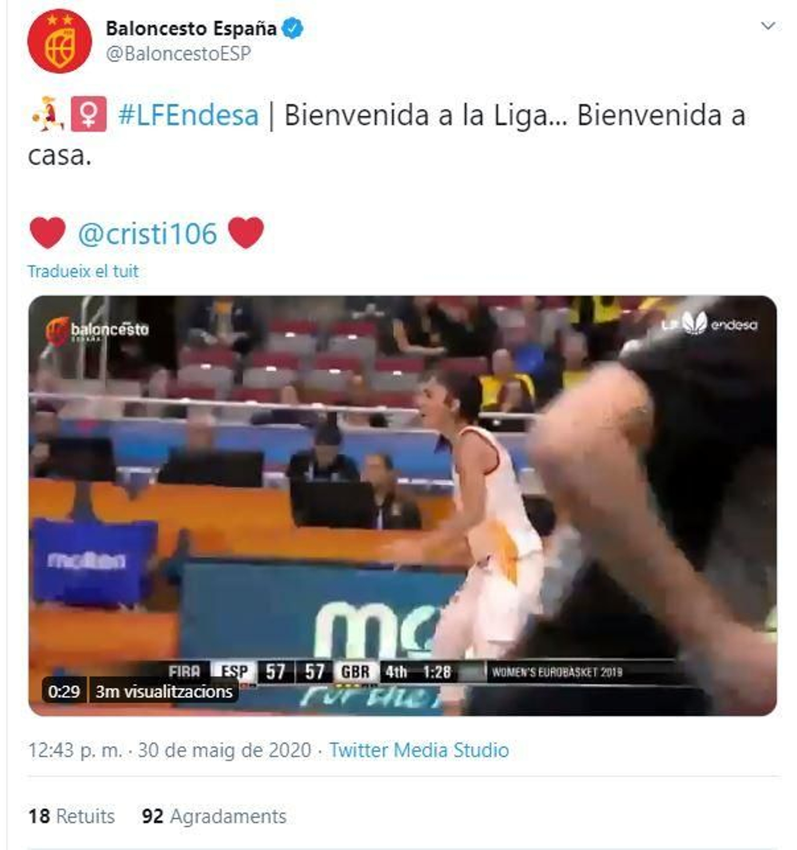 El retorn de la base internacional a Espanya ha sigut fins i tot ben rebut per la Federació Espanyola de Bàsquet que en les seues xarxes ha publicat un tuit.