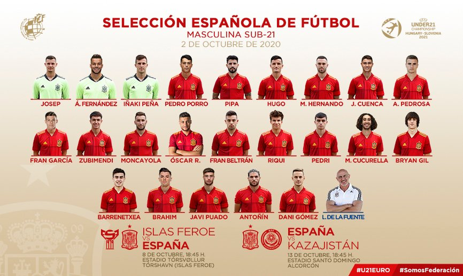 El combinat de De la Fuente ha de disputar dos partits de la classificació per a l'Europeu. El primer serà a les Illes Fèroe amb la selecció d'aquell país el dia 8 d'octubre, mentre que el 13 es veurà les cares a Madrid amb l'equip de Kazakhstan.