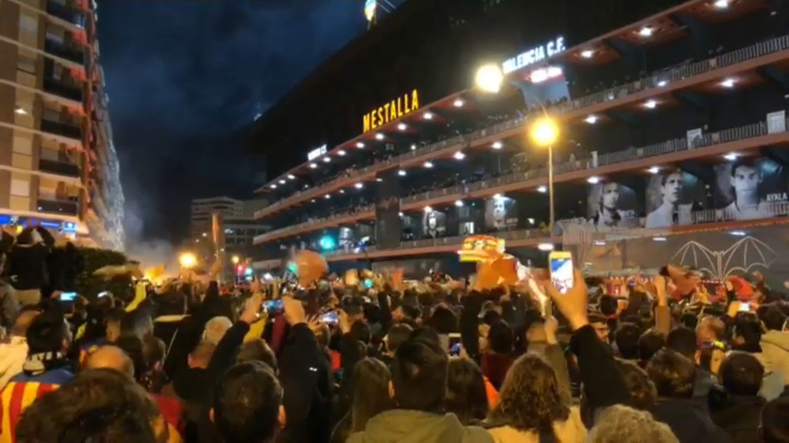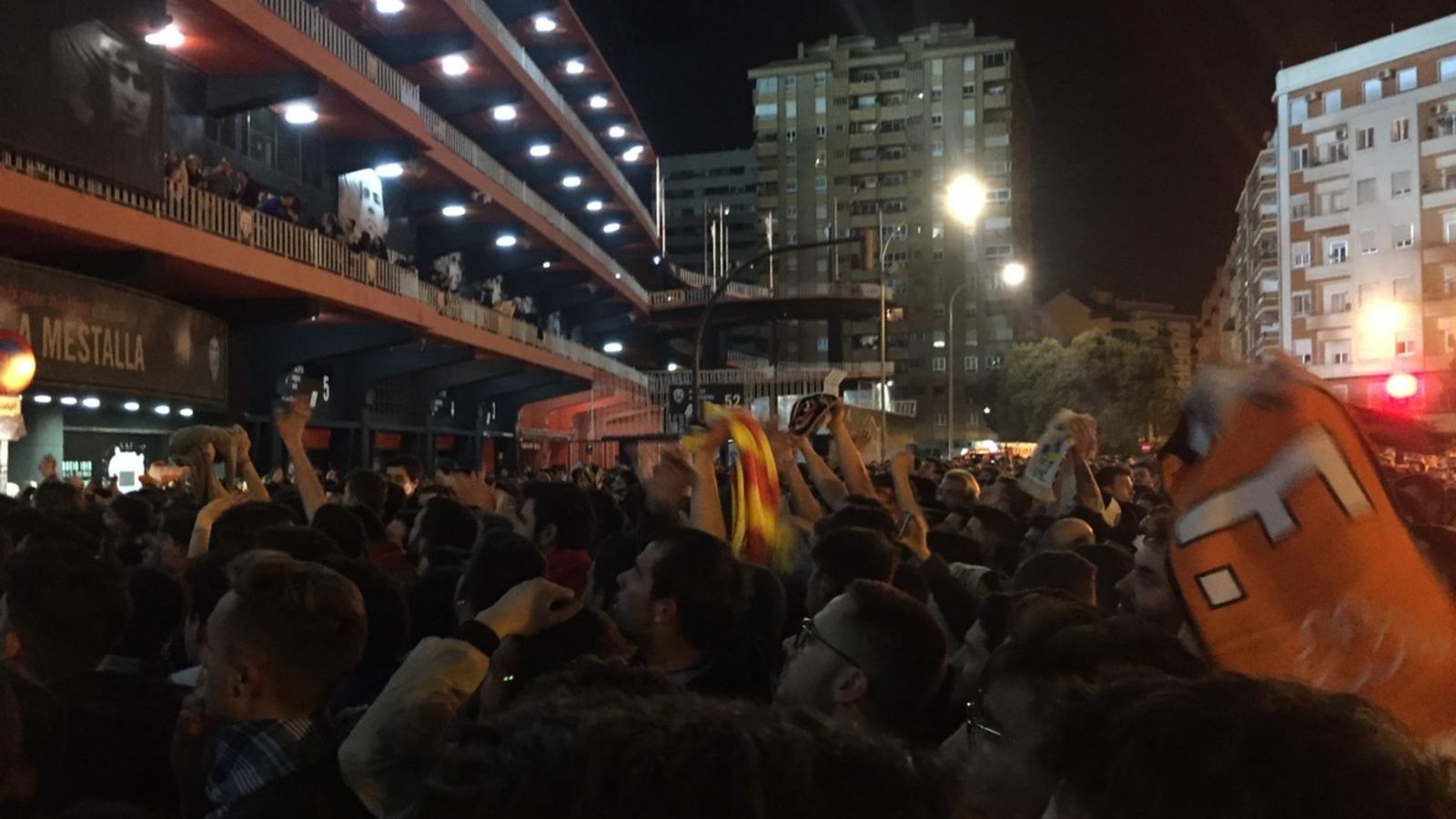 Just després que acabara el partit de tornada contra el Betis (1-0) i que ha classificat el València per a la final de la Copa del Rei, que es disputarà el 25 de maig i que l'enfrontarà al FC Barcelona, l'afició s'ha concentrat a l'avinguda de Suècia, a les portes de l'estadi de Mestalla, esperant els jugadors. Com estava previst, han eixit al balcó exterior de la Tribuna per a celebrar amb els aficionats la fita d'una nova final l'any del centenari. Fa onze anys que el València no arriba a una final i molts aficionats ho celebraven per primera vegada.