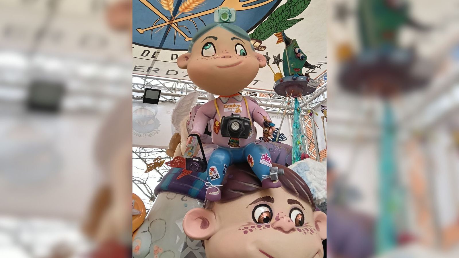 Dins del lema de la falla que és "De festa en festa" veiem a un reporter que acudeix a tots els esdeveniments possibles.