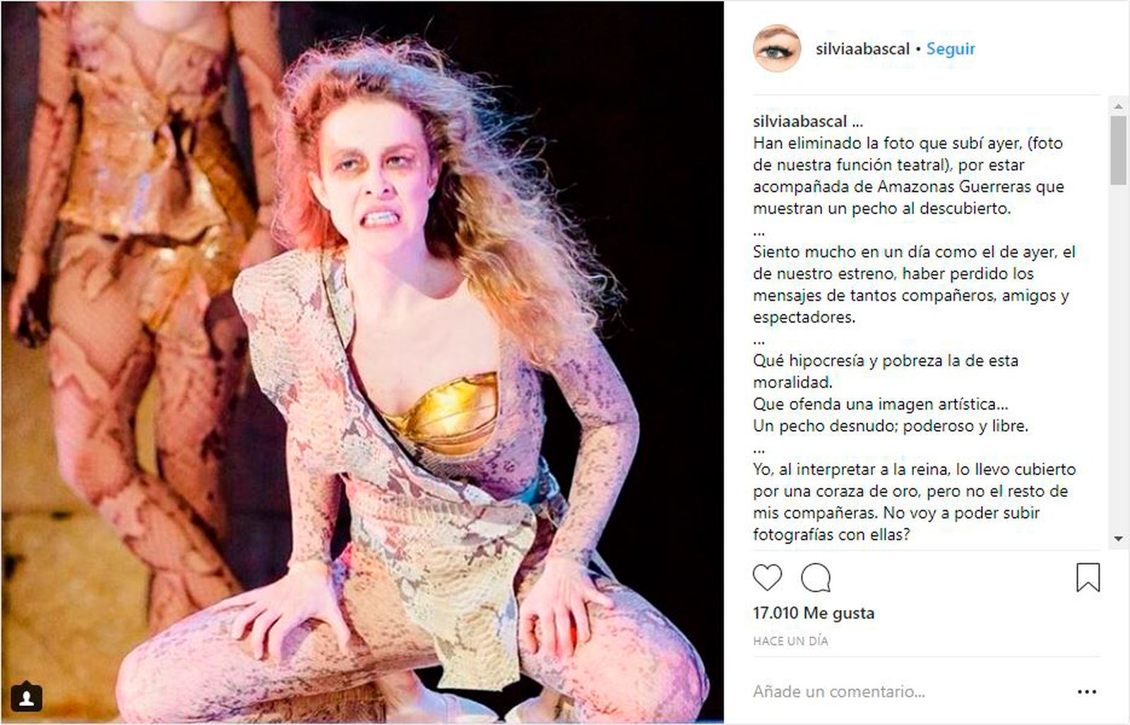 És per això que en el vestuari de l’obra, el dissenyador Lorenzo Caprile, com és habitual, les ha representades, a totes, excepte a la reina, interpretada per Silvia Abascal, amb un pit a l’aire. I precisament aquest detall, que forma part de la tradició cultural i històrica, ha fet que Instagram interprete com a inadequada una publicació de l’actriu, en la qual apareix a l’escenari acompanyada d'algunes d’aquestes amazones.