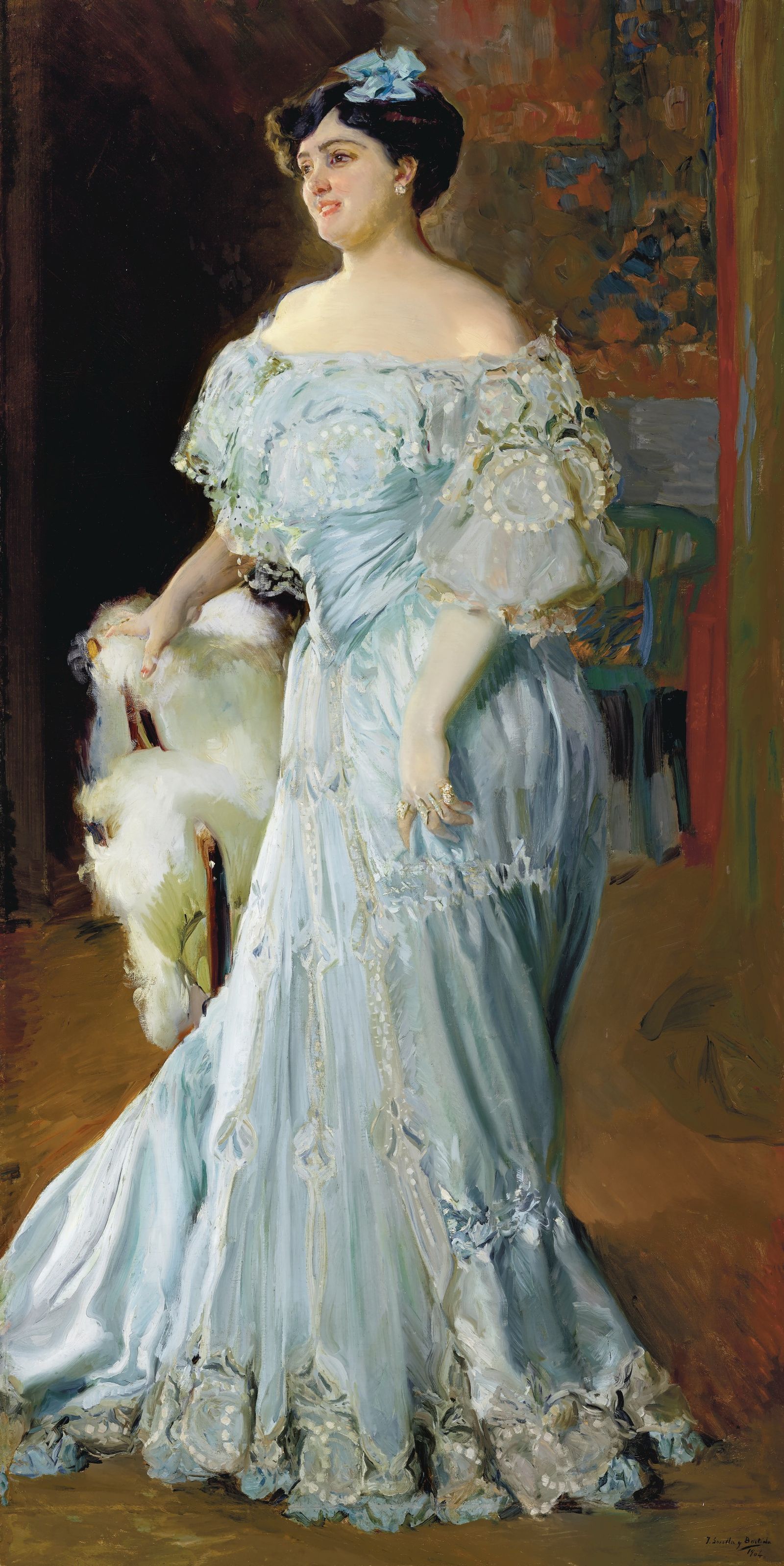 Sorolla la va pintar als 30 anys, quan estava en la cúspide de la fama mostrant-la com la gran diva que era. L'artista llueix un vestit de seda color aiguamarina i encaix blanc, un assortiment de brillants anells a la mà i arracades de diamants.