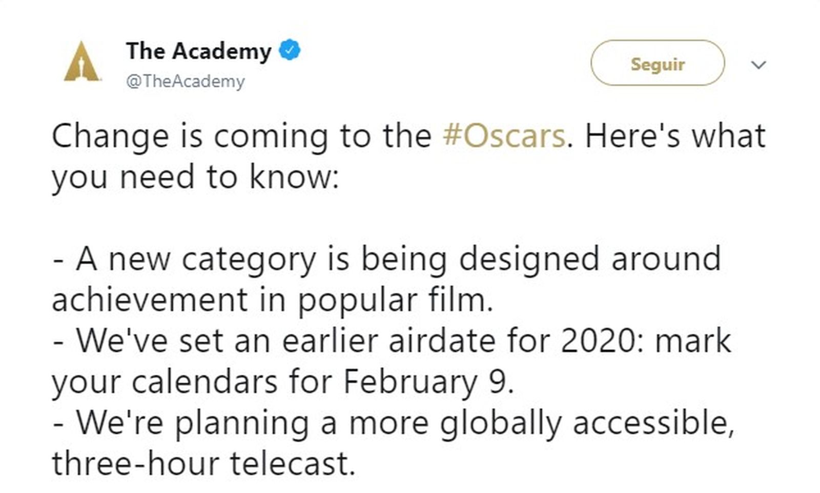 A més de la nova categoria, l'última reunió de la junta va decidir limitar la retransmissió de la gala a un màxim de tres hores, un moviment que s'interpreta com una maniobra per a guanyar-se una audiència cada vegada més minsa. L'última edició, de fet, va experimentar una caiguda d'un 19%, la pitjor dada de la història. L'Acadèmia assegura que així aconseguiran fer els premis "més accessibles als espectadors de tot el món".