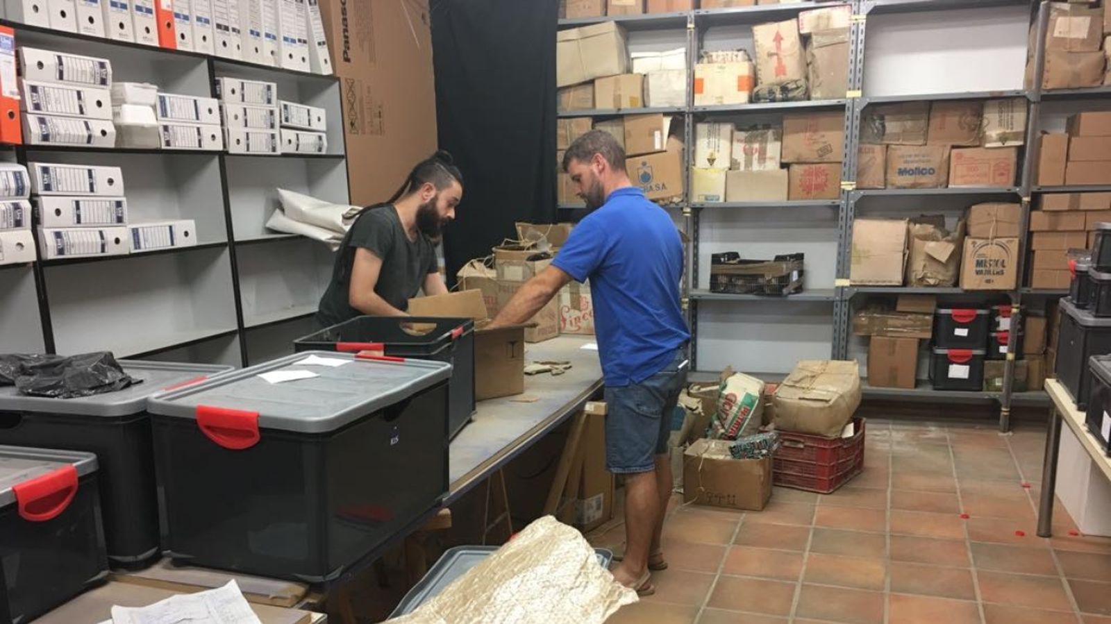 Un estudiant en pràctiques i un conserge cataloguen ara peces iberes que es van guardar en caixes als anys setanta a Benicarló.