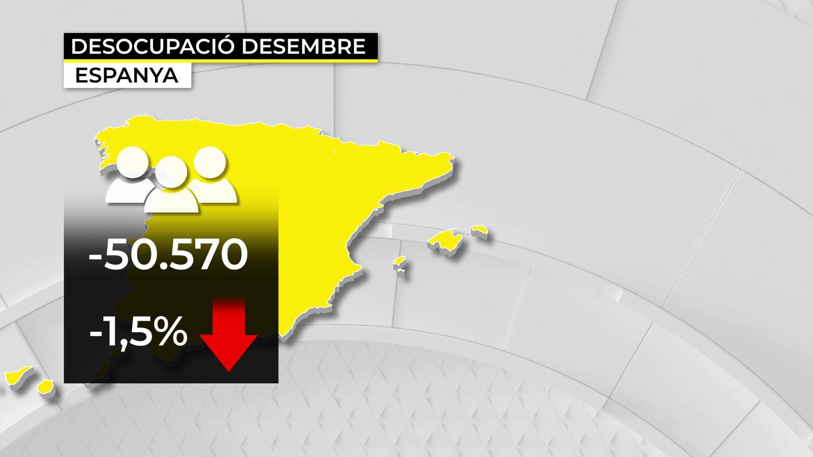 Segons les dades publicades pel Ministeri de Treball, el nombre de gent sense faena registrada va caure al desembre en 50.570 persones respecte al mes anterior (1,5% menys), principalment per l'eixida de la desocupació de 43.874 persones en el sector serveis.