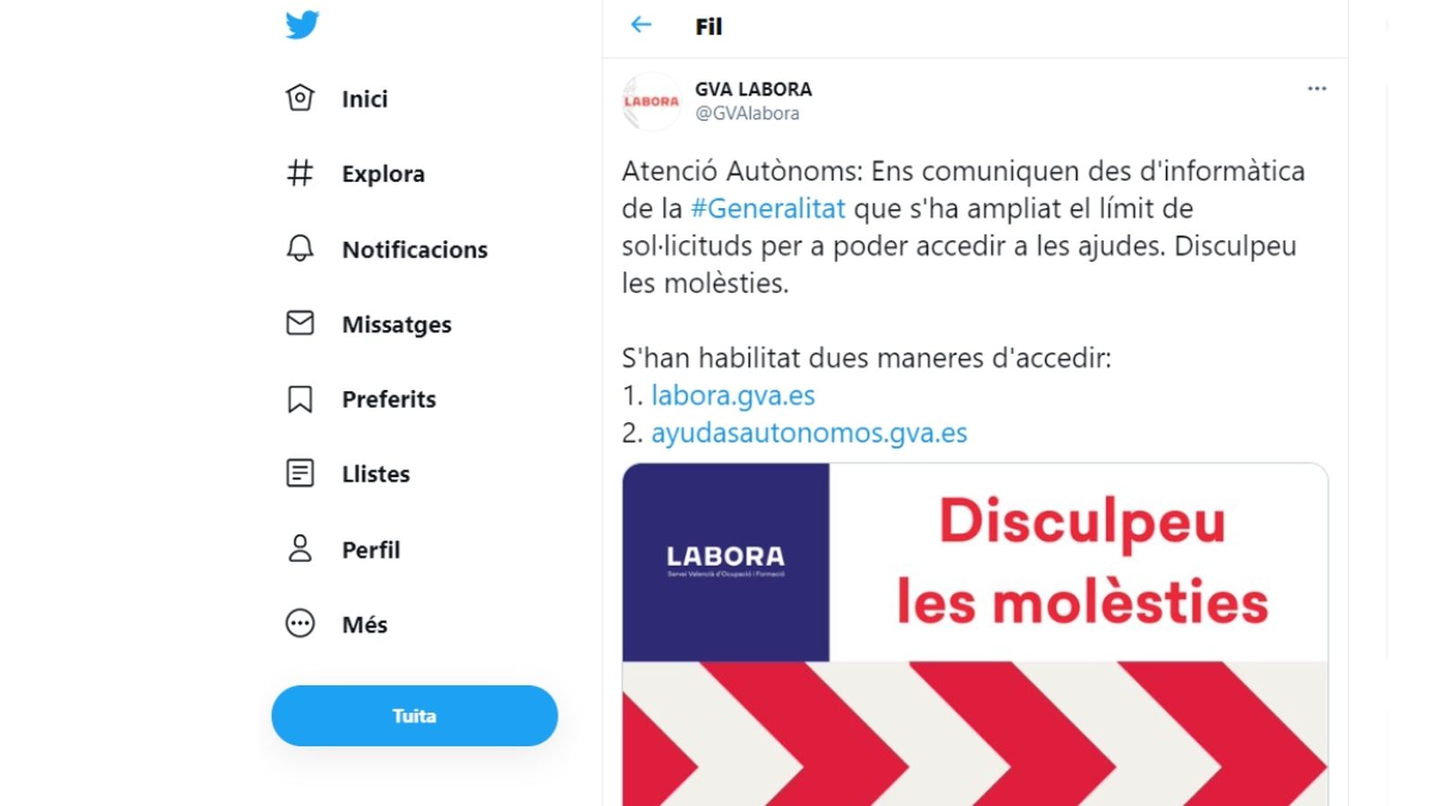 Bon dia, el nostre web està col·lapsat a causa de l'alta demanda. Des de Labora estem treballant en solucionar la gestió de les ajudes per a persones autònomes perquè estiga disponible al més prompte possible. Disculpeu les molèsties. Gràcies per la vostra paciència”. Amb aquest missatge en Twitter Labora demana disculpes pel col·lapse en el web de la Generalitat a causa de l'allau de sol·licituds d'ajudes directes a empreses i persones treballadores autònomes per la Covid-19, que podien començar a demanar-se des de les 9 del matí.