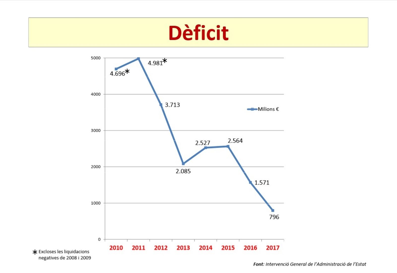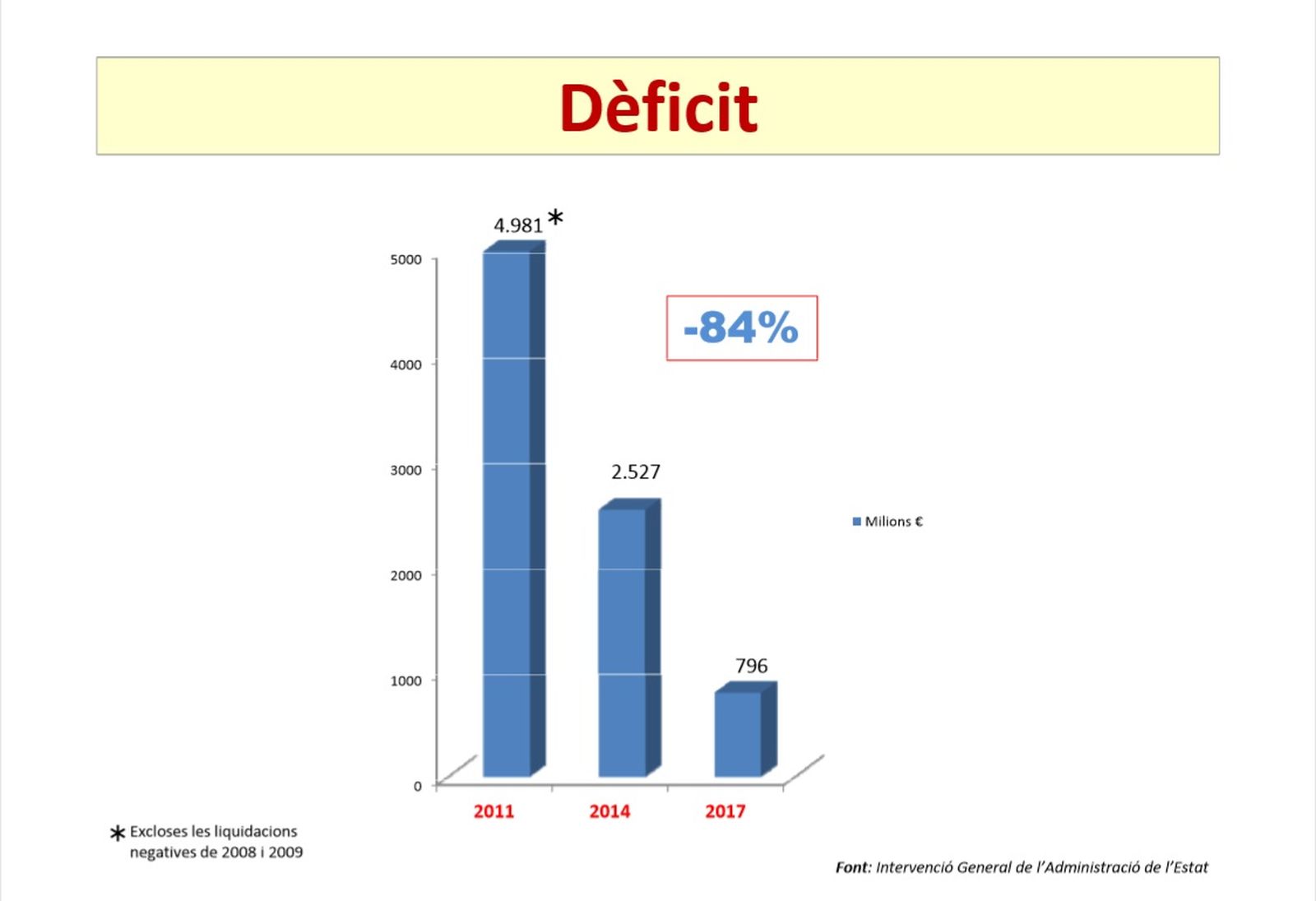 Des de 2014, el darrer any complet de gestió de l'anterior govern autonòmic, l'objectiu del dèficit fou d'1,6 punts, 12 vegades més gran que el registrat durant el 2017. També podem veure la baixada que hem tingut des del 2011, quan es va arribar al 84% de dèficit, amb xifres desorbitades com uns números rojos de vora 5.000 milions i un equivalent al -4,95% del PIB.
