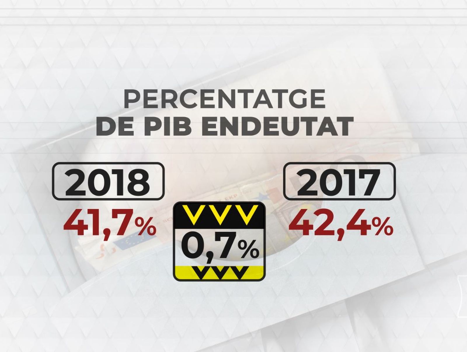 El deute públic de la Comunitat Valenciana és de 47.084 milions d’euros en 2018. Això es tradueix en un 41,7% del PIB, taxa que s’ha reduït set dècimes respecte de l’any anterior.