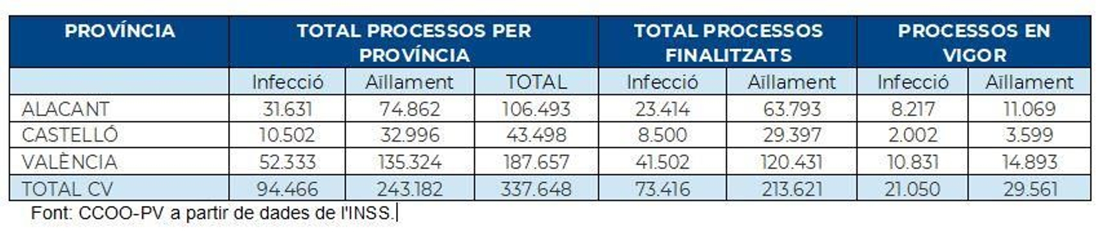 Les dades corresponen a un informe de Comissions Obreres del País Valencià (CCOO PV), que atribueix a la Comunitat Valenciana 337.648 processos d'incapacitat temporal por Covid-19 des de l'inici de la pandèmia, un de cada deu dels 3.331.761 que s'han quantificat a tot Espanya. 94.466 de les incapacitats al conjunt del territori valencià van ser a conseqüència d'infeccions, i 243.182 es van produir com a resultat d'aïllaments preventius per contagis a l'entorn laboral, social o familiar.