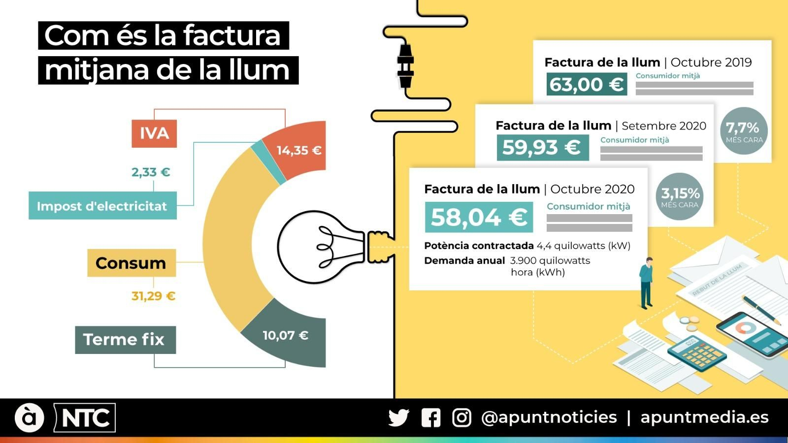 La factura mitjana de la llum per a un consumidor domèstic ha trencat a l'octubre la tendència alcista dels últims cinc mesos i és un 3,15% més barata respecte al mes de setembre i del 7,7% respecte a l'octubre de l'any passat. Així, el rebut mitjà ascendeix a l'octubre a 58,04 euros, 1,90 euros menys que fa un mes (59,93 euros) i quasi 5 euros (4,96 euros) menys respecte al que es pagava fa un any (63 euros), segons dades de la Comissió Nacional dels Mercats i la Competència (CNMC). Aquest abaratiment ve impulsat pel descens en el preu de la llum facilitat per la major presència de les energies renovables.