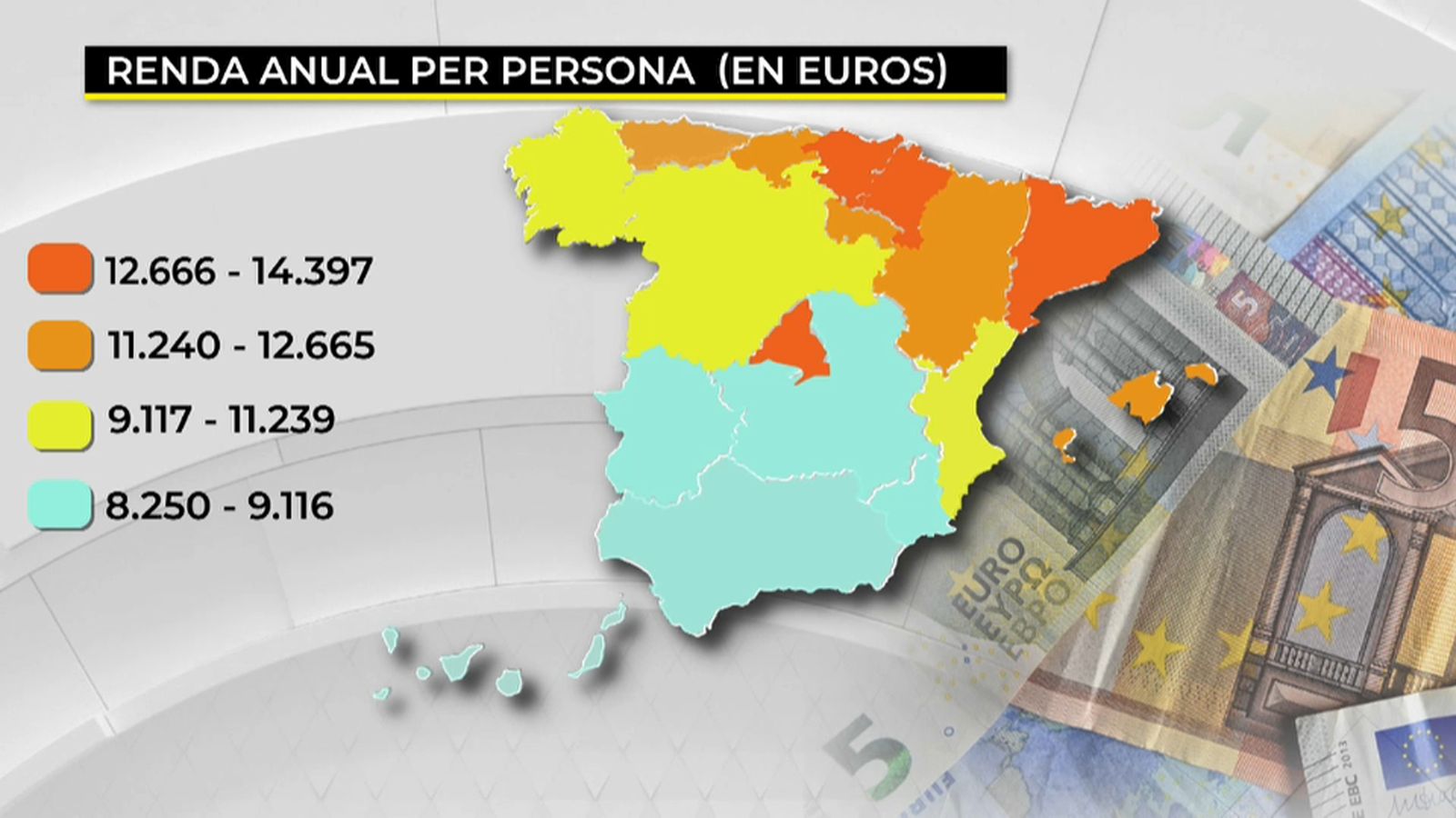 Per comunitats, Extremadura té la renda anual per persona més baixa, 8.250€. La situació a la Comunitat Valenciana és un poc millor, amb una renda anual mitjana de 9.800€ per persona. No obstant això, estem encara molt lluny d’altres comunitats, com ara la de Madrid, Navarra o el País Basc, que encapçala el rànquing amb una renda mitjana de més de 14.000€ a l’any.