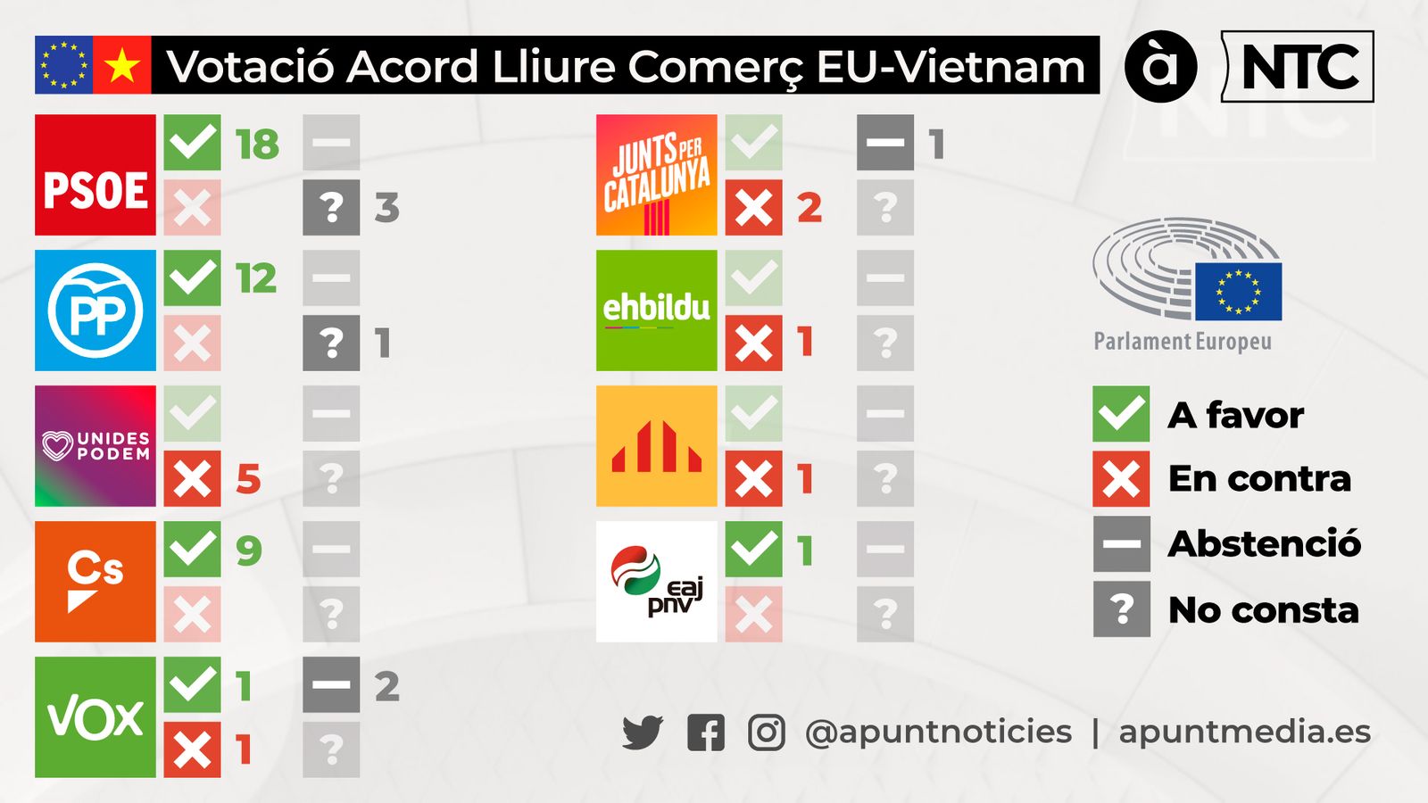 El PP, el PSOE, Ciutadans i el Partit Nacionalista Basc han votat en bloc a favor de l’Acord de Lliure Comerç entre la Unió Europea i la República Socialista del Vietnam, que facilitarà l'entrada d'arròs del país asiàtic al mercat europeu. Encara que la Unió de Llauradors i Ramaders va sol·licitar als europarlamentaris espanyols i valencians que hi votaren en contra, com a mesura de prevenció fins que no s'haja fet una anàlisi exhaustiva sobre la repercussió econòmica que podria tindre per als productors i es coneguen amb detall els efectes sobre el canvi climàtic que suposen les importacions.