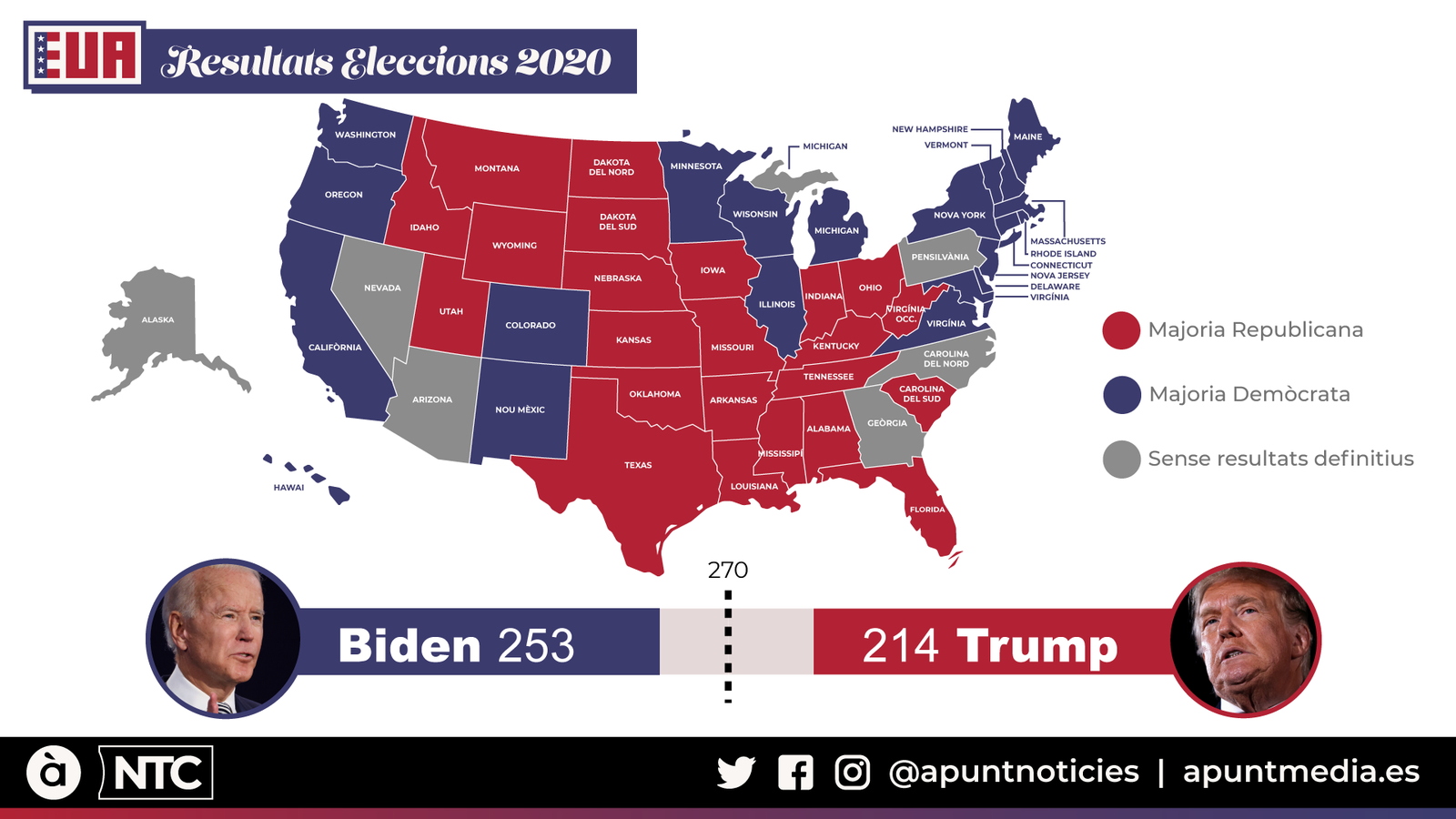 Després d’arrabassar-li els estats claus de Wisconsin i Michigan a l’actual president dels Estats Units, Donald Trump, Biden suma almenys 253 compromissaris al Col·legi Electoral, enfront dels 214 que ha acumulat Trump, en el seu objectiu comú d'arribar als 270 que donen la victòria.
