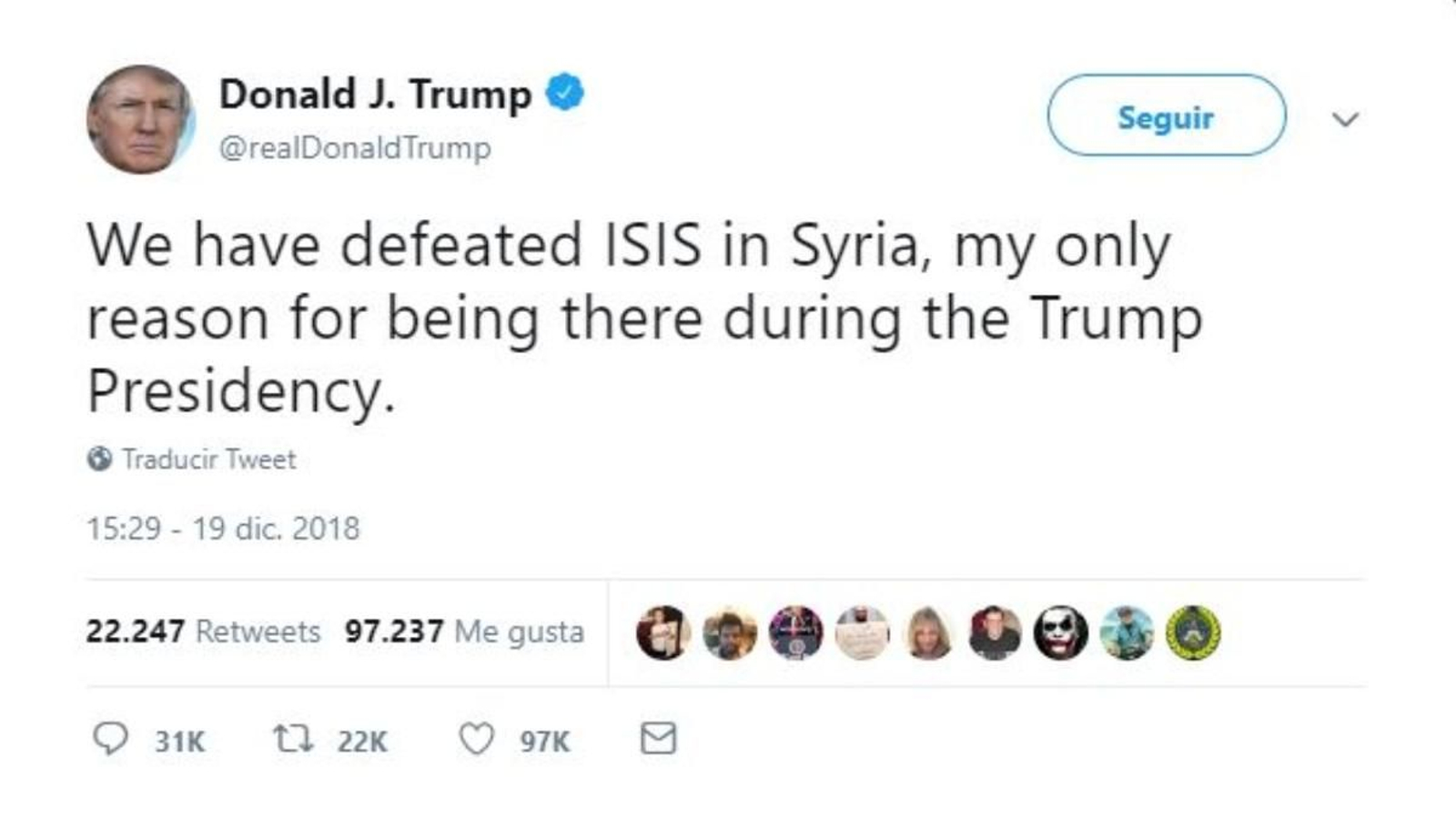 Sanders ha fet aquest anunci després que Trump declarara la victòria enfront de l'Estat Islàmic a través d'un missatge en Twitter. "Hem derrotat l'EI a Síria, l'única raó per a estar allí durant la Presidència de Trump", va publicar a Twitter el mandatari, acompanyat d'un vídeo en el qual insisteix que ha arribat el moment de retirar-se del país àrab.