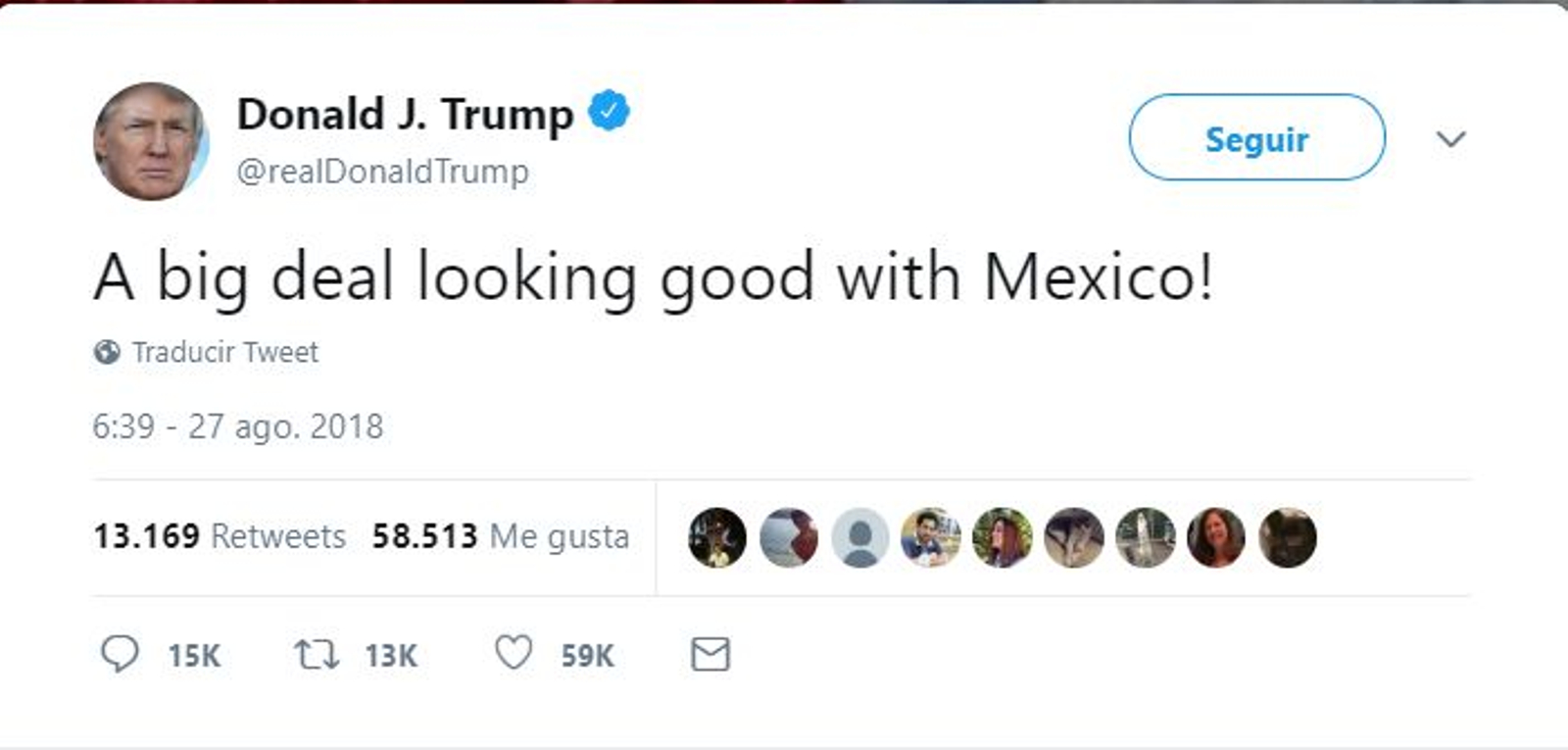 "És un gran dia per al comerç. És un gran dia per al nostre país", ha dit Trump al Despatx Oval de la Casa Blanca, on va conversar per telèfon amb el seu homòleg mexicà, Enrique Peña Nieto, per confirmar que havien aconseguit tancar el pacte bilateral després de setmanes de negociacions.