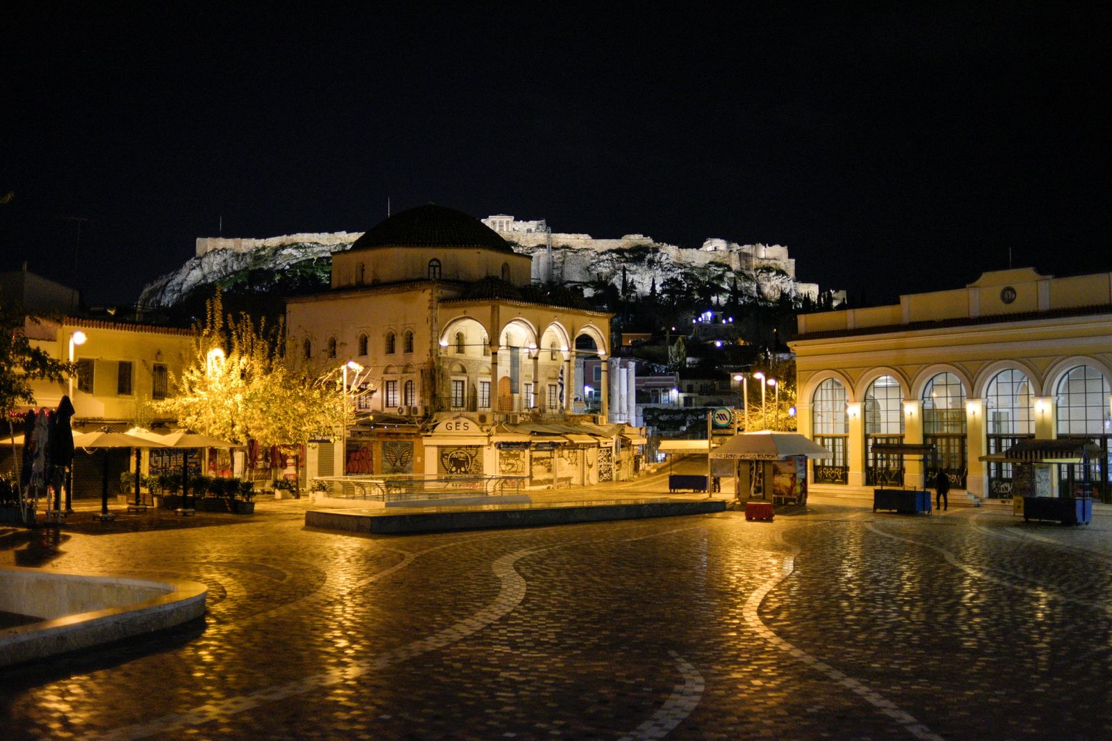 La plaça Monastiraki va quedar completament deserta des de les 22:00 h, moment en què va començar el toc de queda imposat pel govern per tal d'impedir les celebracions de Cap d’Any als carrers, restaurants i locals d'oci nocturn.