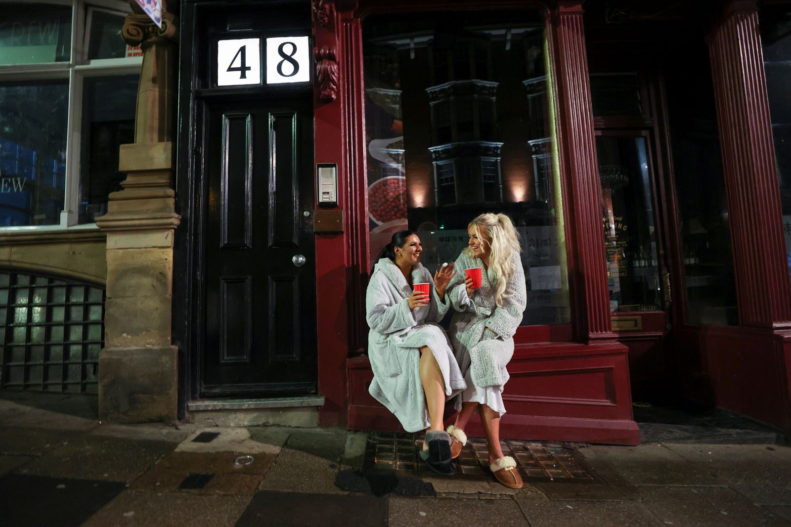 Dos dones en batí i sabates de casa ixen al carrer a felicitar l'any nou.