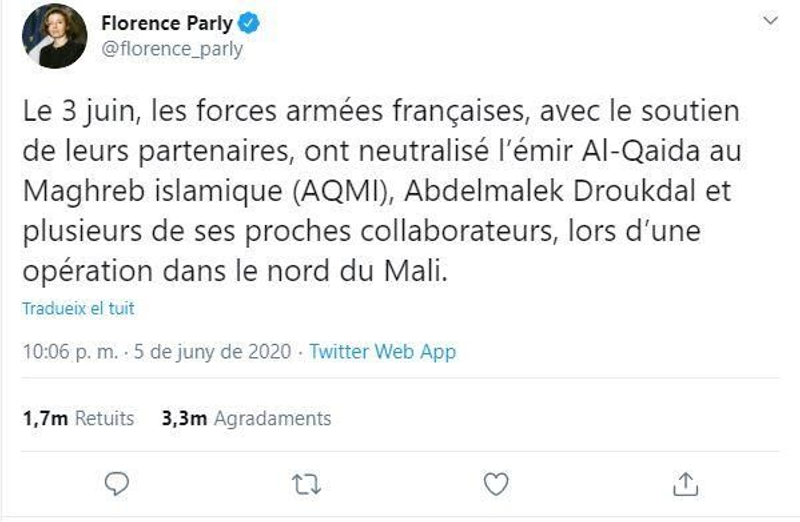 La ministra de Defensa francesa, Florence Parly, ha explicat en el seu compte de Twitter que Droukdel era membre del comité directiu d'Al Qaeda i estava al capdavant del conjunt dels components d'aquesta organització jihadista al nord d'Àfrica i al Sahel.