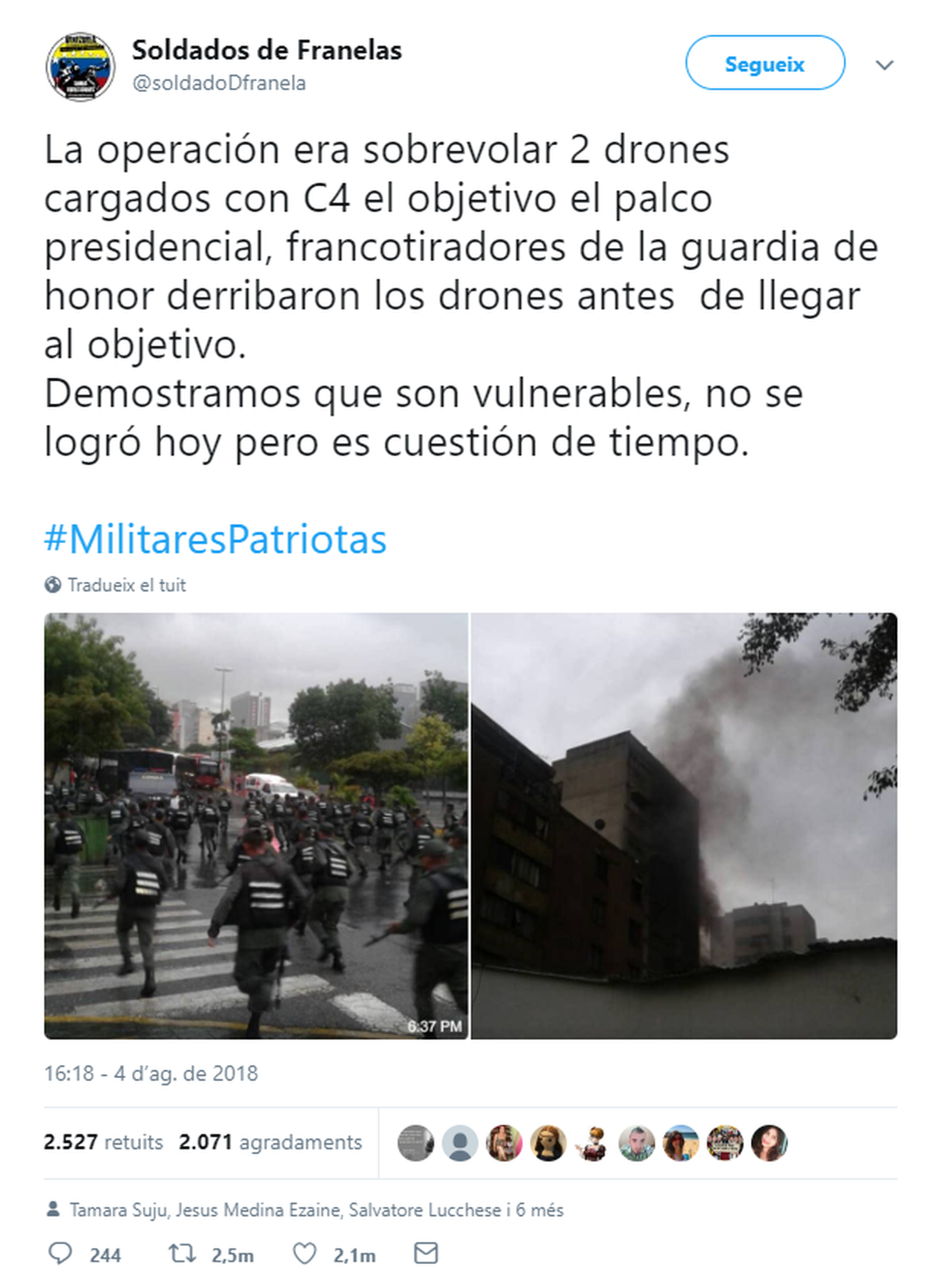 En el seu compte de Twitter, Soldados de Franelas ha penjat diverses imatges de l'atac i un missatge on expliquen el pla, que, segons indiquen, consistia a dur explosius C4 fins a la tribuna presidencial mitjançant els dispositius aeris. "Demostrem que són vulnerables. No ha pogut ser hui, però es qüestió de temps", han afirmat en un missatge en la xarxa social.