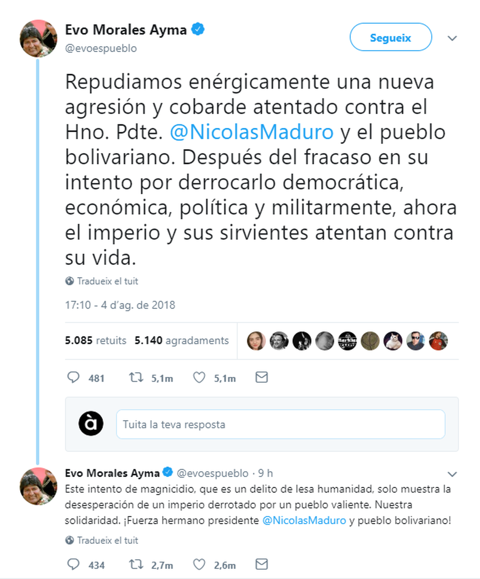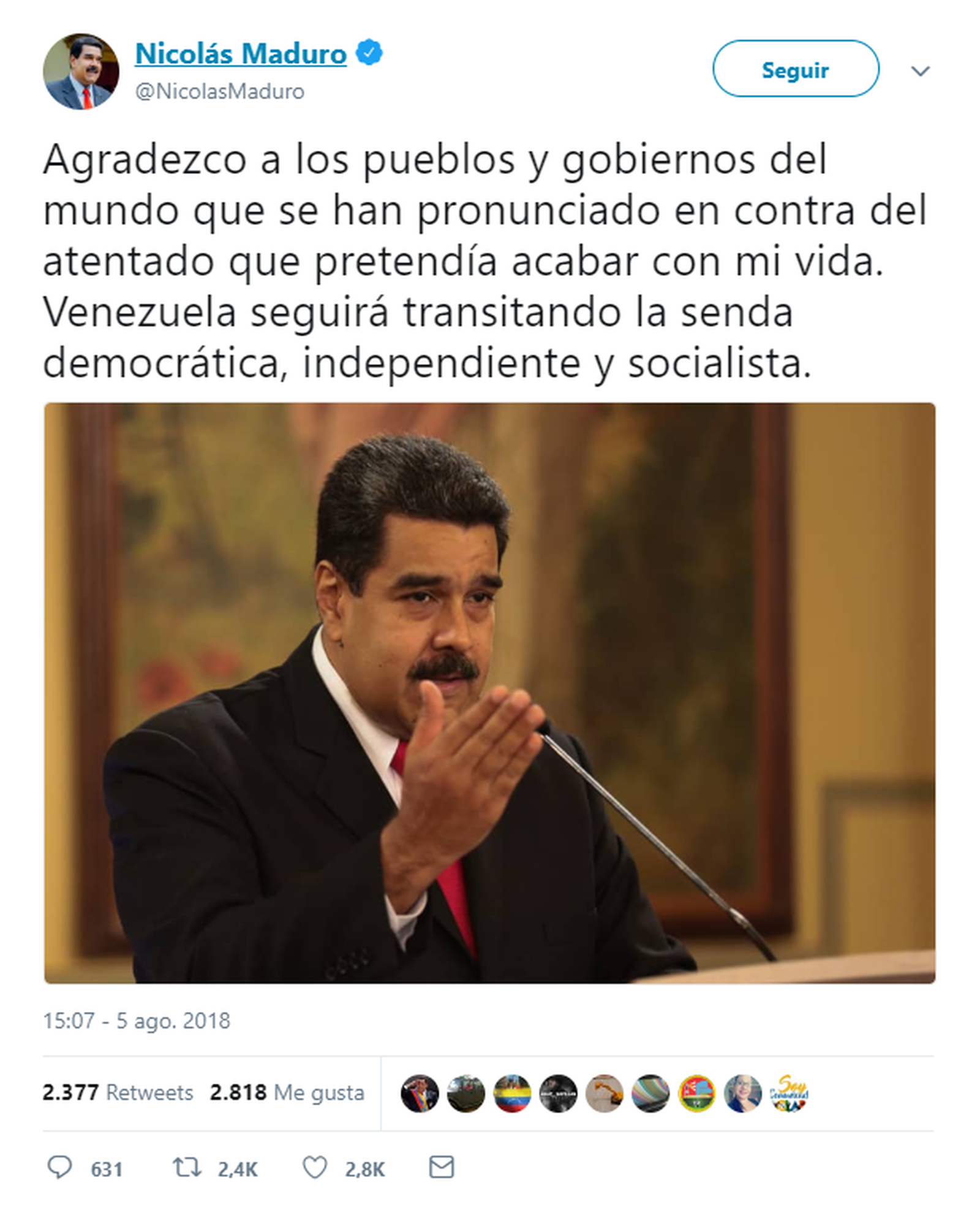 L'anomenat Movimiento Nacional Soldados de Franelas de Veneçuela s'ha atribït l'autoria de l'atemptat contra el president del país, Nicolás Maduro. Franctiradors de les forces de seguretat han avortat l'atac amb un parell de drons amb càrrega explosiva durant l'acte de commemoració a Caracas dels 81 anys de la Guàrdia Nacional Bolivariana, la policia militar del país. En la retransmissió de la cerimònia per televisió es pot veure com evacuen del lloc dels fets Maduro i el ministre de Defensa, Vladimir Padrino.