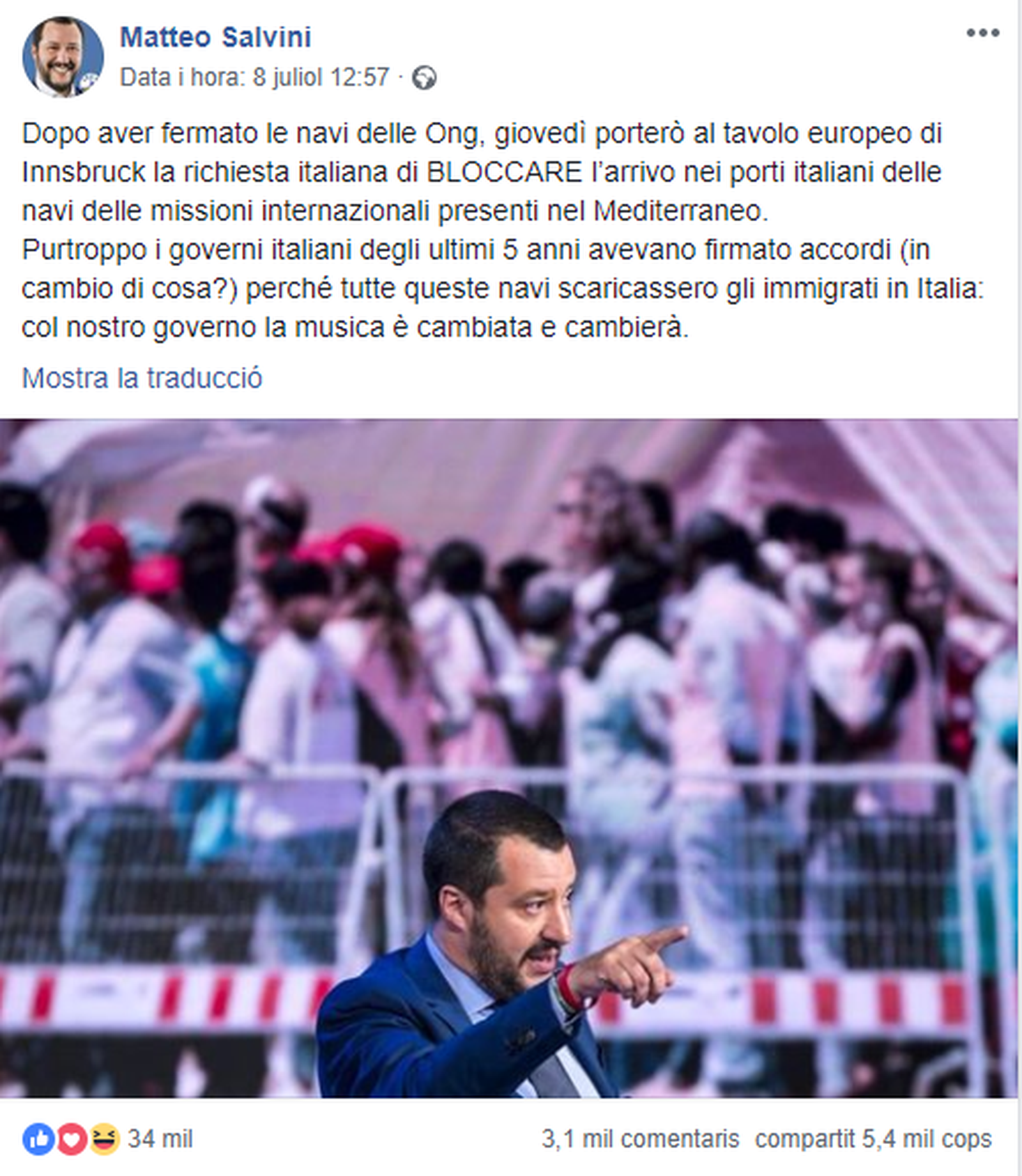 "Després d'aturar els vaixells de les ONG, dijous portaré al Consell europeu a Innsbruck la proposta italiana de bloquejar l'arribada als ports italians de les embarcacions de les missions internacionals presents al Mediterrrani. Lamentablement, els governs italians dels últims cinc anys han signat acords (a canvi de què?) perquè totes aquestes embarcacions descarreguen els immigrants a Itàlia. Amb el nostre govern, la música ha canviat i canviarà."
