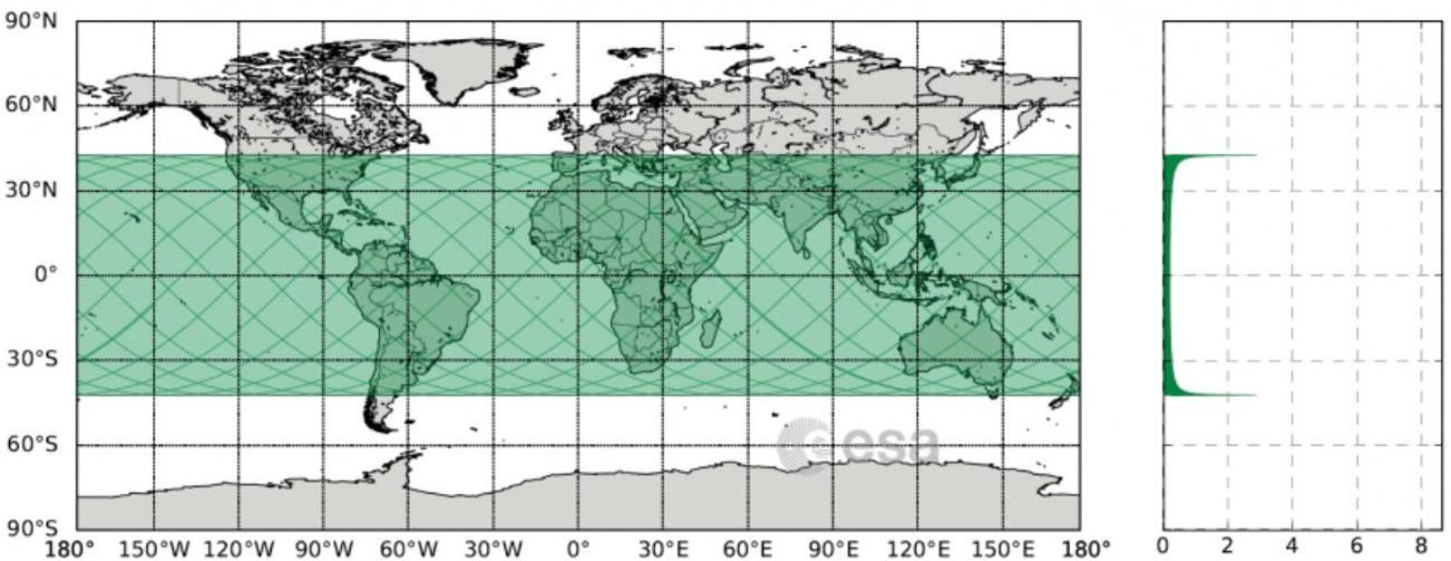 En verd, la zona on pot caure. A la dreta, gràfic de percentatge de probabilitat de caiguda segons la latitud / Agència Espacial Europea