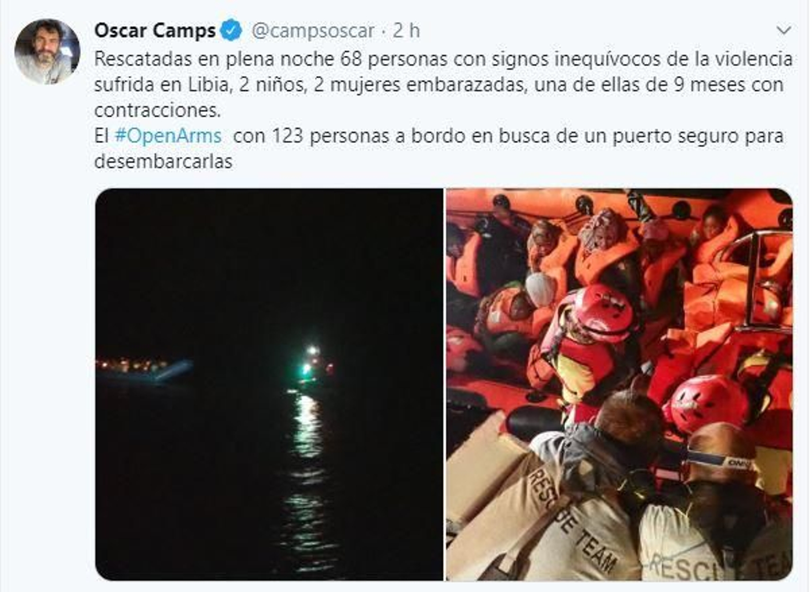 Amb això són 124 les persones rescatades al Mediterrani per l’Open Arms en menys de 24 hores. L’ONG demana un port segur on desembarcar els migrants, mentre que a Itàlia, on el govern manté una política de ports tancats a les ONG que rescaten persones migrants al Mediterrani, el ministre de l’interior Matteo Salvini impulsa una llei que preveu multes entre 10.000 i 50.000 euros a aquestes organitzacions si entren, travessen o atraquen en les seues aigües territorials amb persones rescatades al Mediterrani.
