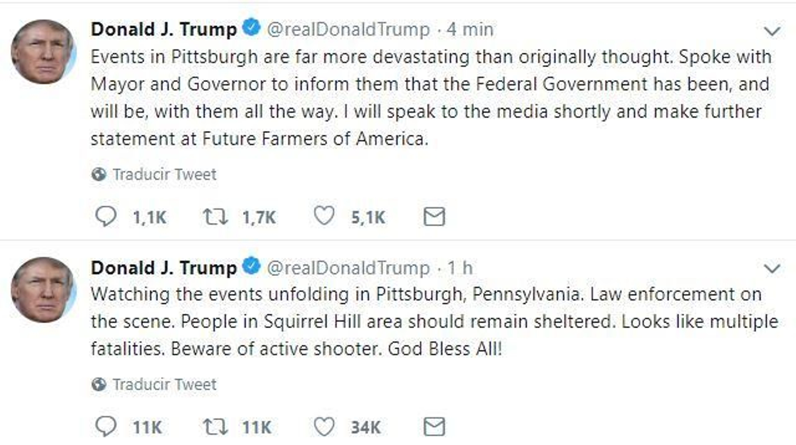 Poc abans, Trump havia traslladat el seu condol a les víctimes mitjançant el seu compte de Twitter, en què explica que el succés ha sigut “més devastador del que es pensava en un principi”.