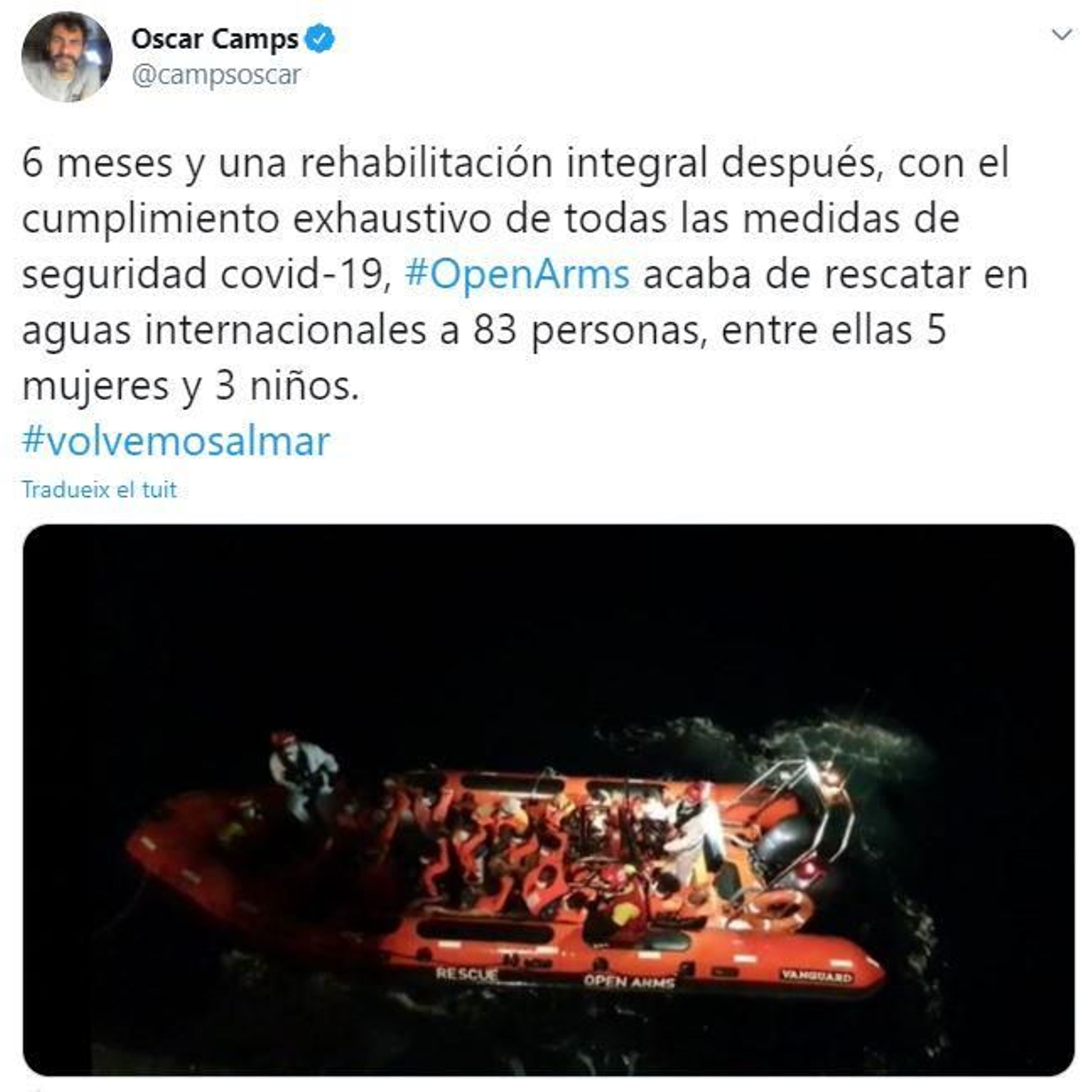 L'embarcació de l'ONG Open Arms ha rescatat 83 persones d'una embarcació en risc de naufragi al Mediterrani central, segons ha explicat l'organització a través de Twitter. En la nau viatjaven cinc dones i tres menors, segons ha especificat el fundador de l'organització, Óscar Camps.
