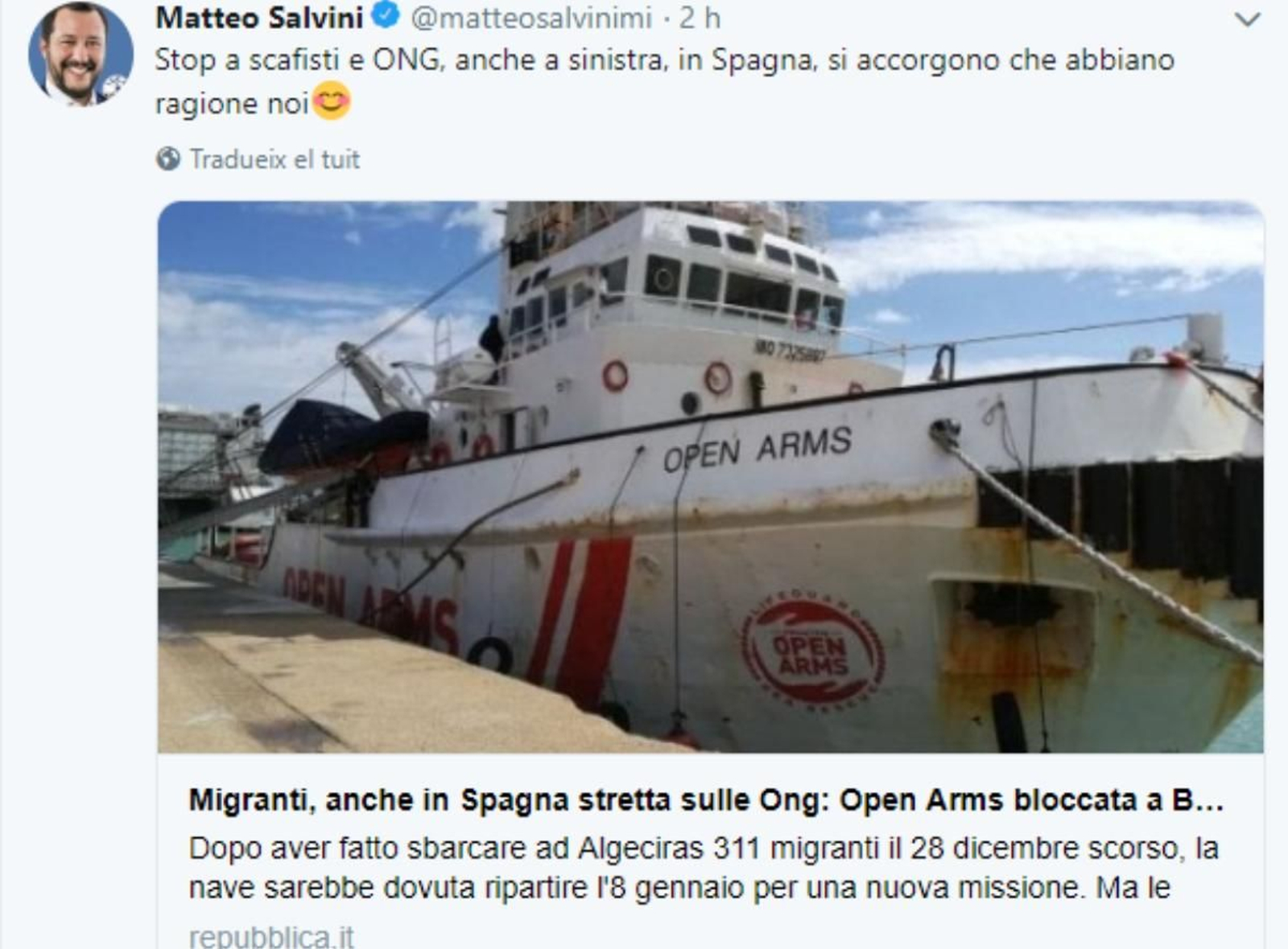 Amb un missatge al seu compte de Twitter el ministre de l’Interior italià, l’ultradretà Matteo Salvini, ha celebrat que el govern espanyol haja bloquejat al port de Barcelona l’Open Arms, un dels vaixells més reconeguts en la tasca de rescat d’immigrants a la Mediterrània.