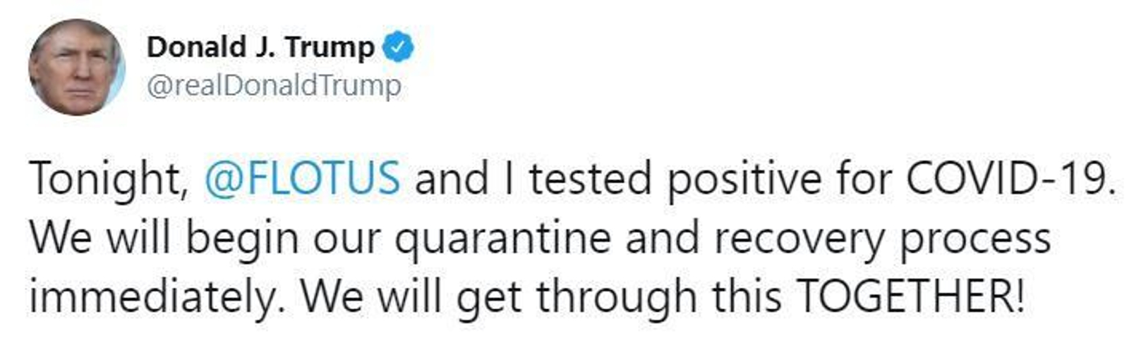 Donald Trump ha donat positiu en coronavirus. El president dels Estats Units ho ha notificat en el seu compte de Twitter. "Aquesta nit, la primera dama i jo mateix hem donat positiu en Covid-19. Comencem el nostre procés de quarantena i recuperació immediatament. Junts ho superarem!", ha escrit Trump en la xarxa social de la qual és assidu.
