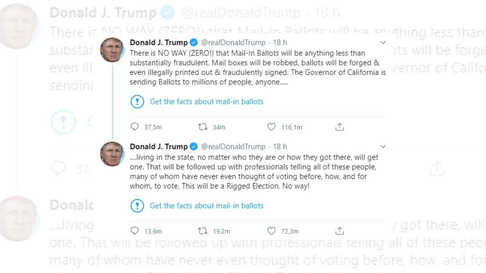 Trump ha contestat que no permetrà que la multinacional interferisca en la seua “llibertat d’expressió” per a verificar el contingut dels seus missatges. “Twitter està interferint en les eleccions presidencials de 2020. Diuen que la meua afirmació sobre el vot per correu, que provocarà corrupció i frau massiu, és incorrecta, basant-se en verificacions de notícies falses”, ha recriminat Trump, precisament a través d’aquesta xarxa social. Twitter és la ferramenta més usada pel president nord-americà, a través de la qual es comunica directament amb els seus simpatitzants sense passar pel filtre tradicional dels mitjans, i on acumula més de huitanta milions de seguidors.