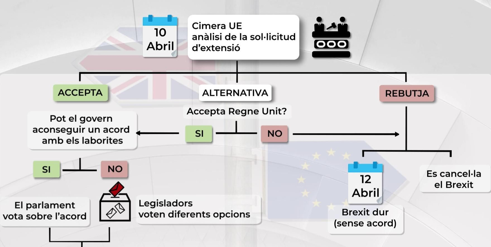 Si el Consell Europeu no proposara cap ajornament del Brexit i no hi haguera cap acord entre el govern britànic i l’oposició, el Regne Unit hauria de sortir de la Unió Europea de manera abrupta el 12 d'abril. La Comissió Europea ja ha valorat aquesta possibilitat com una "bogeria" i el "pitjor de tots els resultats".