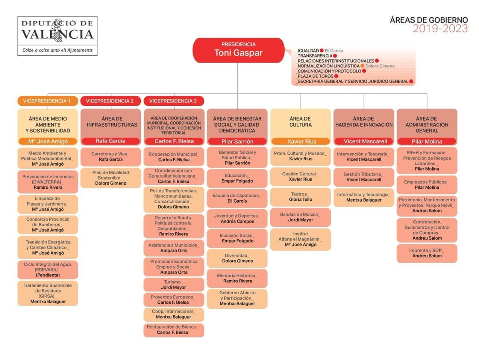 L’organigrama, presentat aquest dijous per Gaspar als mitjans, tindrà set àrees de govern, de les quals cinc s’assignen als socialistes, i dos, a Compromís. Gaspar tindrà atribuïdes les competències de Transparència, Relacions Institucionals, Comunicació i Protocol, Plaça de Bous i Secretaria General i Servei Jurídic General. Dins de l'àrea de Presidència estan integrades les competències d'Igualtat i Normalització Lingüística però no les durà Gaspar. La socialista Eli García portàra l'àrea d'Igualtat i la de Normalització Lingüística la dirigirà Dolors Gimeno, de Compromís.