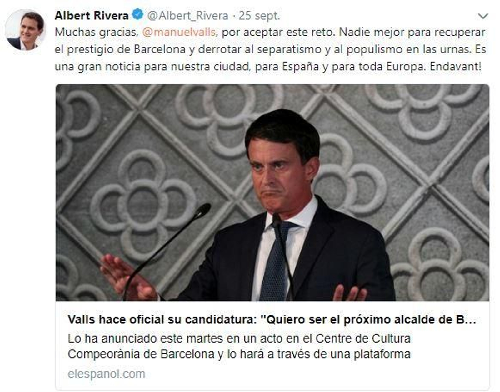 Tot i l’espenta del líder de Ciutadans, Albert Rivera, a aquesta candidatura, Valls no ha nomenat encara cap partit polític entre els seus suports ni ha confirmat la possibilitat d’una confluència amb la formació taronja. En la presentació d’ahir va destacar l’absència dels principals líders de partit, Rivera, i la presidenta de la formació a Catalunya, Inés Arrimadas, els quals, per contra, sí que expressaren el seu suport a Valls a través de Twitter.