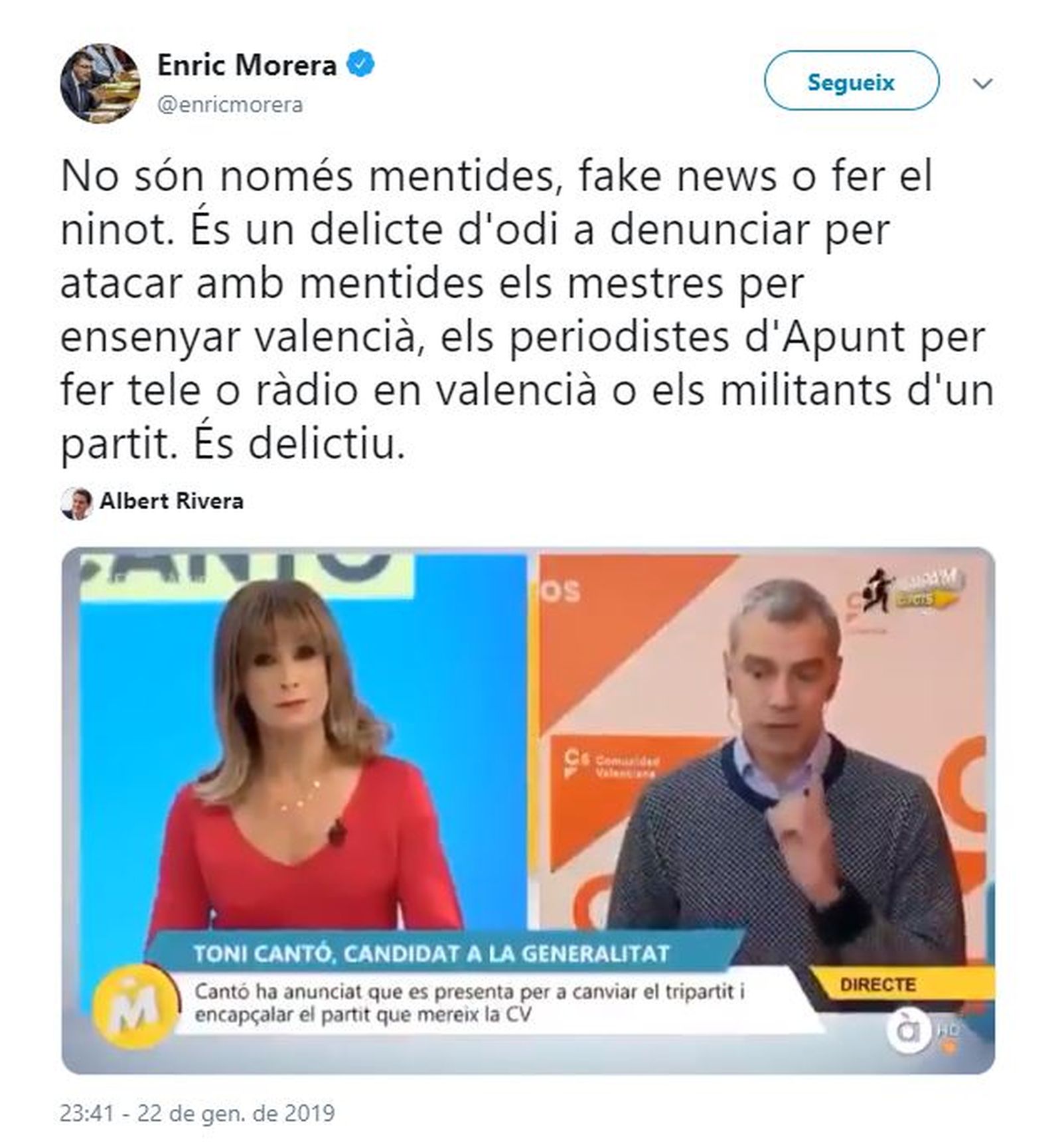 A través d'un comunicat, Enric Morera ha manifestat que en cap moment ha imputat un delicte d’odi a Cantó però ha denunciat “les declaracions reiterades i repetitives contra els professionals de l’ensenyament valencià, contra associacions culturals i cíviques o contra els professionals dels mitjans de comunicació públics valencians, als qui el diputat Cantó ha acusat obertament i públicament de manipular, d’adoctrinar i de malversar”.