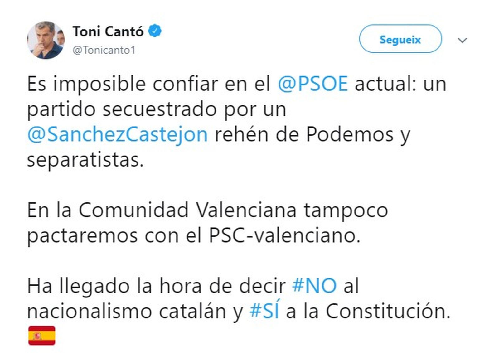 En aquest sentit, el diputat de Ciutadans Toni Cantó també ha manifestat a través del seu compte de Twitter que a la Comunitat Valenciana tampoc pactaran amb el PSPV. “Ha arribat l’hora de dir que no al nacionalisme català i sí a la Constitució”, ha assegurat Cantó.