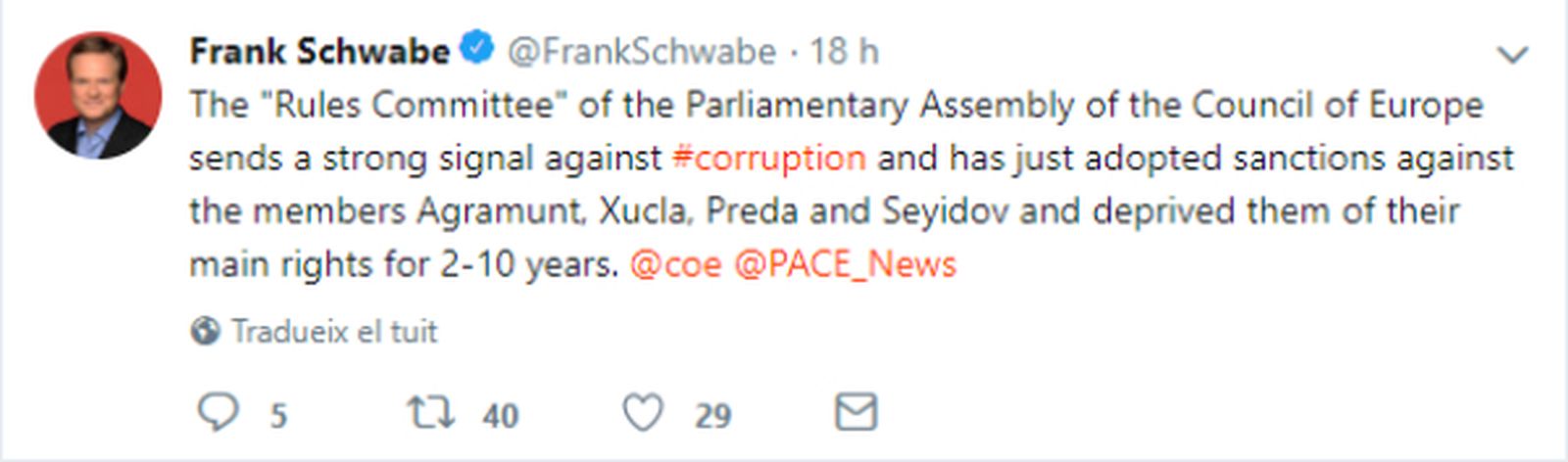Alguns membres de la Comissió han avançat en les xarxes socials la sanció que han acordat per a Agramunt i la consideren un exemple de castic contra la corrupció. El senador del PP va comparéixer dimarts davant de la Comissió per a donar explicacions. La sanció naix d’un informe independent del Consell d'Europa que assenyala l'expresident de la Assemblea Parlamentària, Pedro Agramunt, com un actor "clau" en una trama de corrupció. En un informe de prop de 200 pàgines elaborat pel cos independent d'investigació de l'organisme amb seu a Estrasburg, s'apunta que hi ha fortes sospites que determinats membres es van involucrar en activitats corruptes a favor de l'Azerbaidjan que consistirien a silenciar les crítiques del Consell cap al país. Entre els membres investigats també hi ha el diputat del PDeCat al Congrés Jordi Xuclà.