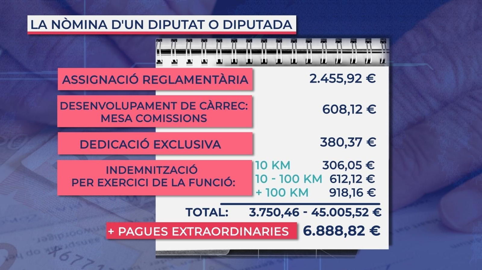 L’assignació reglamentària per als membres de l’hemicicle és de 2.455 euros. A més, com és habitual, pràcticament tots formen part d’alguna de les comissions, bé en la mesa o com a portaveus, i per aquest treball reben 608 euros al mes.