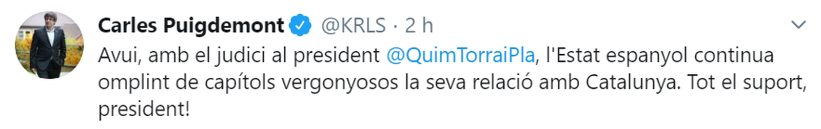 El president de la Generalitat de Catalunya també ha rebut el suport, en la distància, del seu antecessor, Carles Puigdemont, que en un missatge de Twitter ha demanat "tot el suport" per a Torra i ha qualificat el juí de "vergonyós".