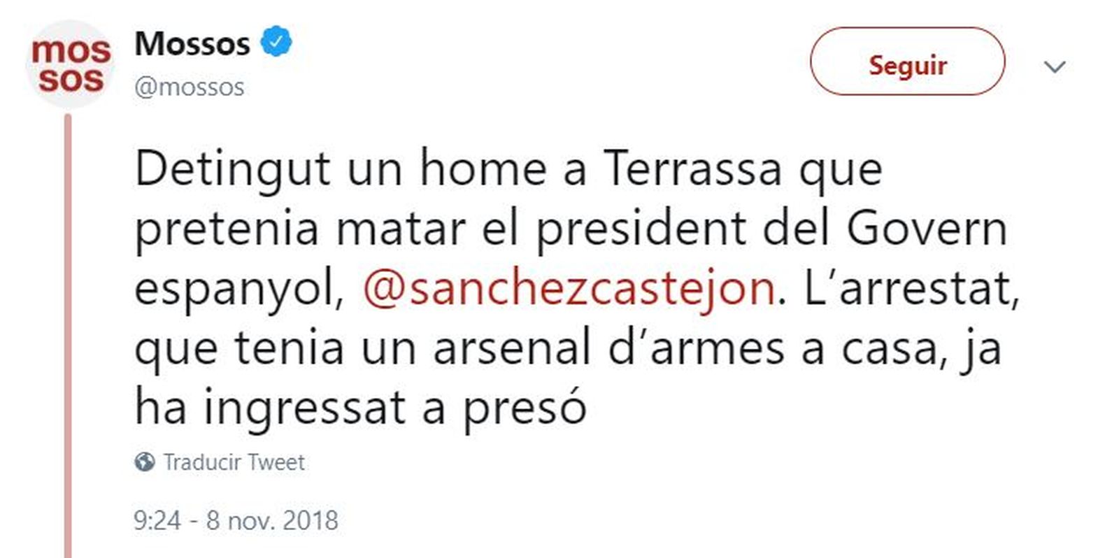 Els Mossos d’Esquadra han confirmat que han detingut un home de 63 anys veí de Terrassa, a Barcelona, que havia manifestat la intenció de acabar amb la vida del president del govern espanyol Pedro Sánchez.