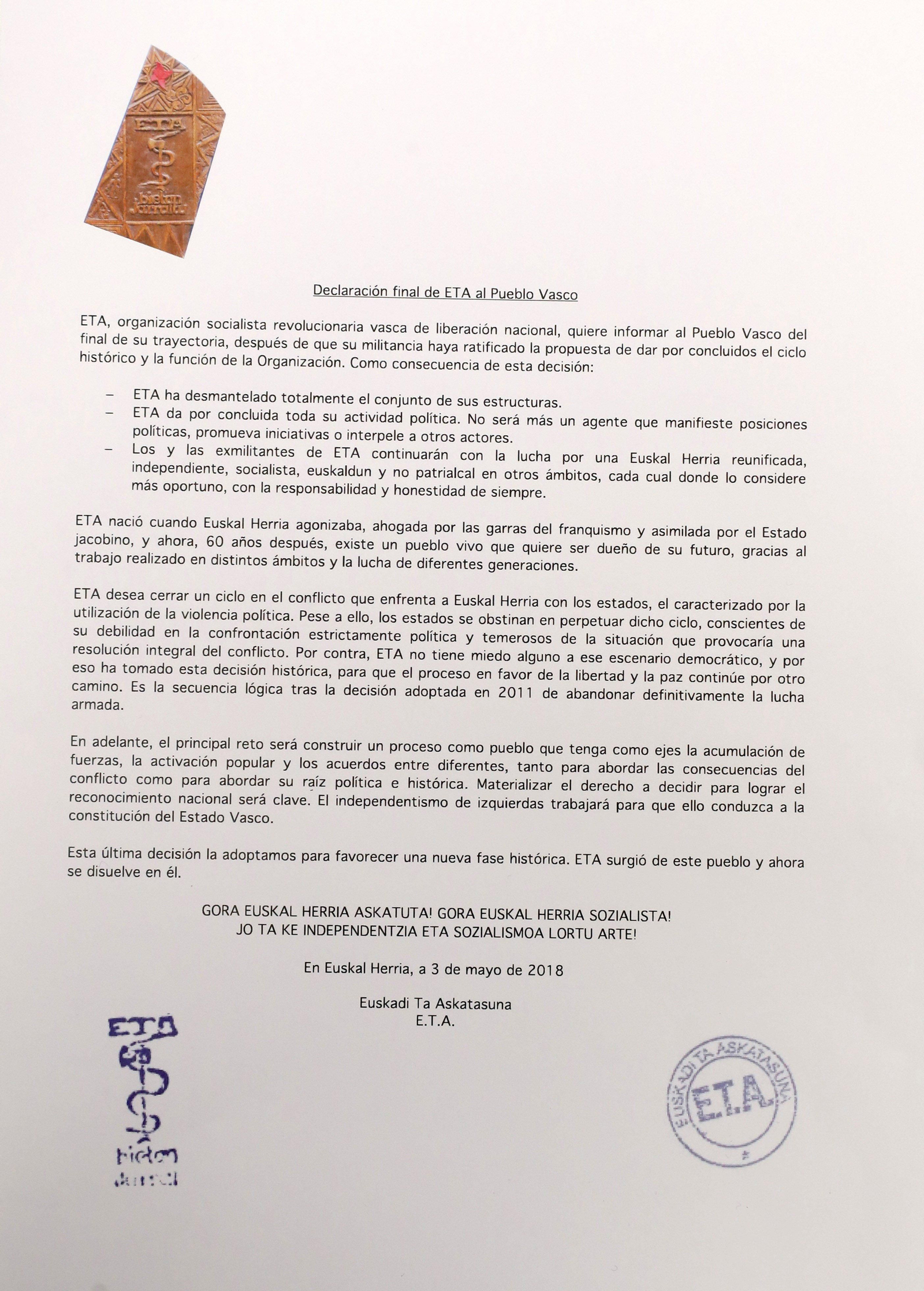 La carta, que s’ha donat a conéixer a la seu de la Centre Henri Dunant de Diàleg Humanitari a Ginebra ja comptaria amb la verificació dels observadors internacionals. En la declaració, adreçada al poble basc, ETA afirma que adopten aquesta última decisió "per a afavorir una nova fase històrica".