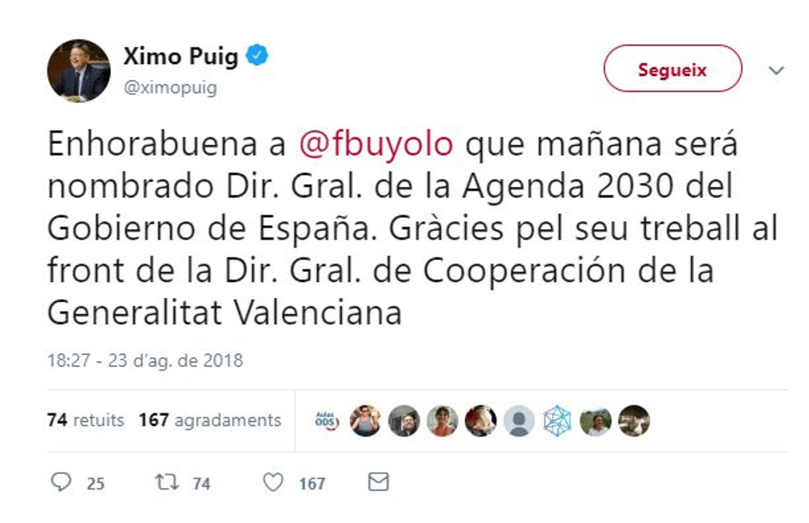 El nomenament l’ha avançat el president de la Generalitat, Ximo Puig, des del seu compte de Twitter. "Enhorabona a Federico Buyolo, que demà serà nomenat director general de l'Agenda 2030 del Govern d'Espanya", ha escrit.